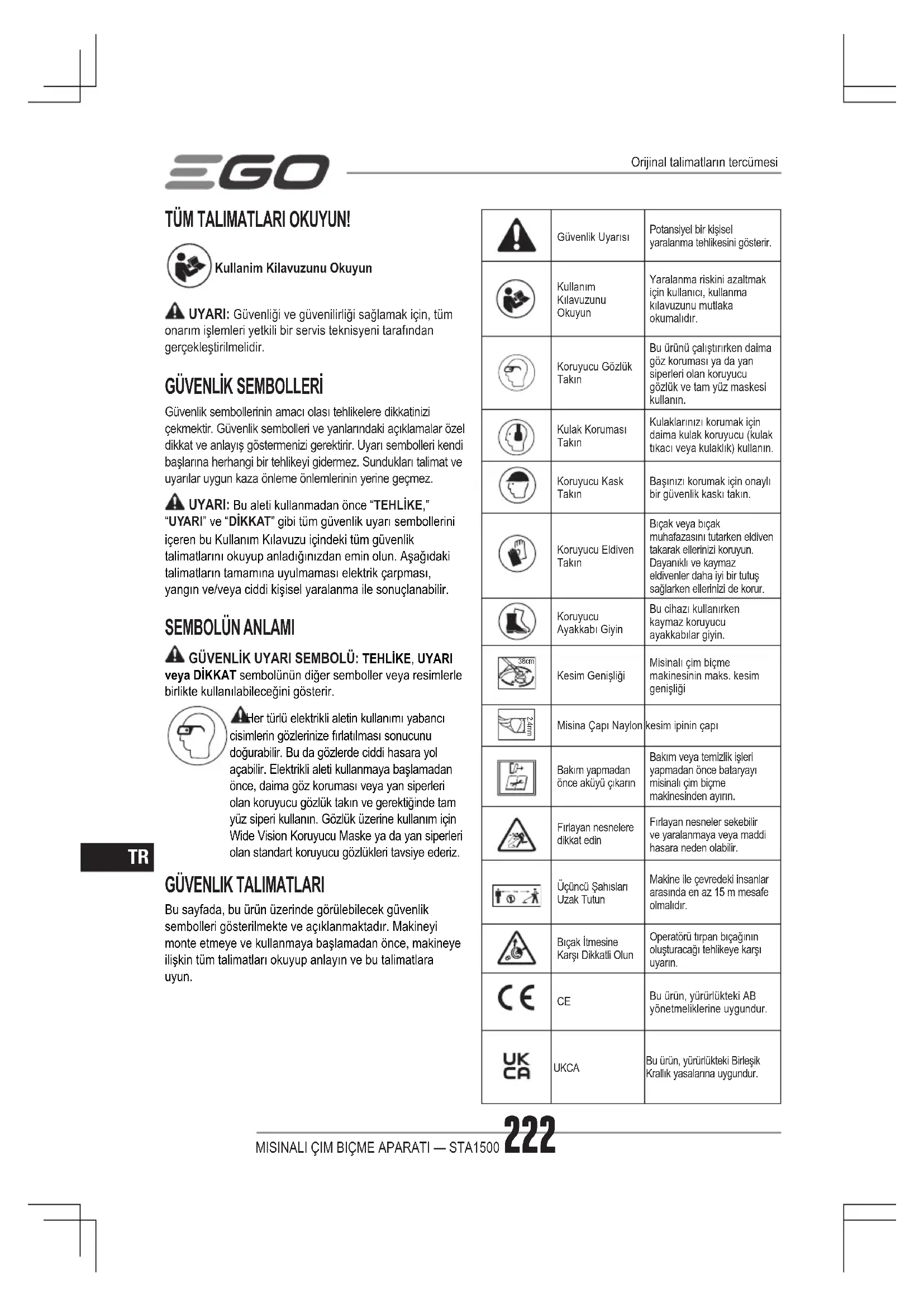 Bu ürün, yürürlükteki AB yönetmeliklerine uygundur. UKCA Bu ürün, yürürlükteki Birleşik Krallık yasalarına uygundur.Orijinal talimatların tercümesiMISINALI ÇIM BIÇME APARATI — STA1500 223