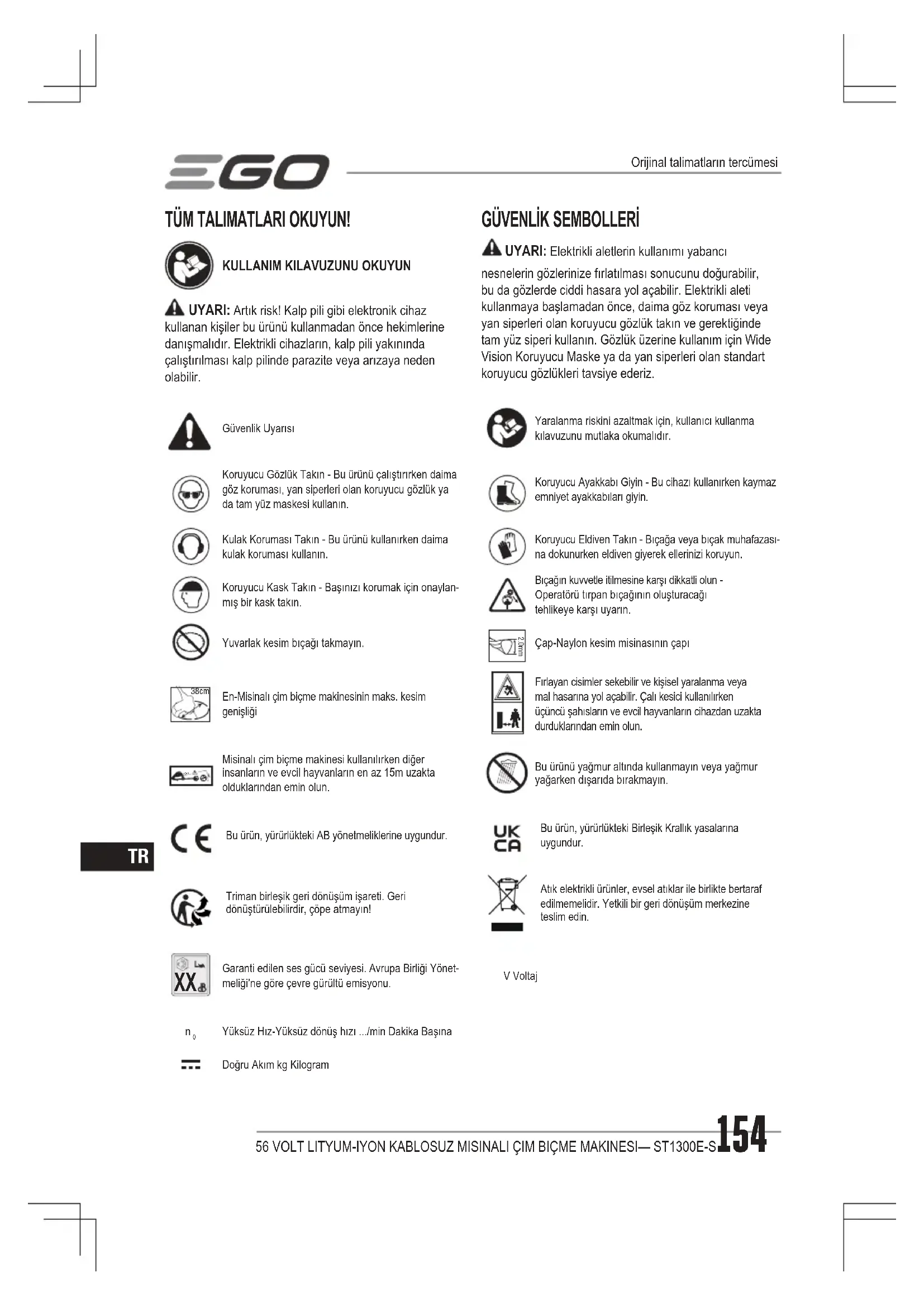 UYARI: Elektrikli aletlerin kullanımı yabancı nesnelerin gözlerinize fırlatılması sonucunu doğurabilir, bu da gözlerde ciddi hasara yol açabilir. Elektrikli aleti kullanmaya başlamadan önce, daima göz koruması veya yan siperleri olan koruyucu gözlük takın ve gerektiğinde tam yüz siperi kullanın. Gözlük üzerine kullanım için Wide Vision Koruyucu Maske ya da yan siperleri olan standart koruyucu gözlükleri tavsiye ederiz. Güvenlik UyarısıYaralanma riskini azaltmak için, kullanıcı kullanma kılavuzunu mutlaka okumalıdır.Koruyucu Gözlük Takın - Bu ürünü çalıştırırken daima göz koruması, yan siperleri olan koruyucu gözlük ya da tam yüz maskesi kullanın.Koruyucu Ayakkabı Giyin - Bu cihazı kullanırken kaymaz emniyet ayakkabıları giyin.Kulak Koruması Takın - Bu ürünü kullanırken daima kulak koruması kullanın.Koruyucu Eldiven Takın - Bıçağa veya bıçak muhafazası-na dokunurken eldiven giyerek ellerinizi koruyun.Koruyucu Kask Takın - Başınızı korumak için onaylan-mış bir kask takın.Bıçağın kuvvetle itilmesine karşı dikkatli olun - Operatörü tırpan bıçağının oluşturacağı tehlikeye karşı uyarın.Yuvarlak kesim bıçağı takmayın. 2.0mmÇap-Naylon kesim misinasının çapı 38cm En-Misinalı çim biçme makinesinin maks. kesim genişliğiFırlayan cisimler sekebilir ve kişisel yaralanma veya mal hasarına yol açabilir. Çalı kesici kullanılırken üçüncü şahısların ve evcil hayvanların cihazdan uzakta durduklarından emin olun. 15m Misinalı çim biçme makinesi kullanılırken diğer insanların ve evcil hayvanların en az 15m uzakta olduklarından emin olun.Bu ürünü yağmur altında kullanmayın veya yağmur yağarken dışarıda bırakmayın.Bu ürün, yürürlükteki AB yönetmeliklerine uygundur.Bu ürün, yürürlükteki Birleşik Krallık yasalarına uygundur.Triman birleşik geri dönüşüm işareti. Geri dönüştürülebilirdir, çöpe atmayın!Atık elektrikli ürünler, evsel atıklar ile birlikte bertaraf edilmemelidir. Yetkili bir geri dönüşüm merkezine teslim edin.