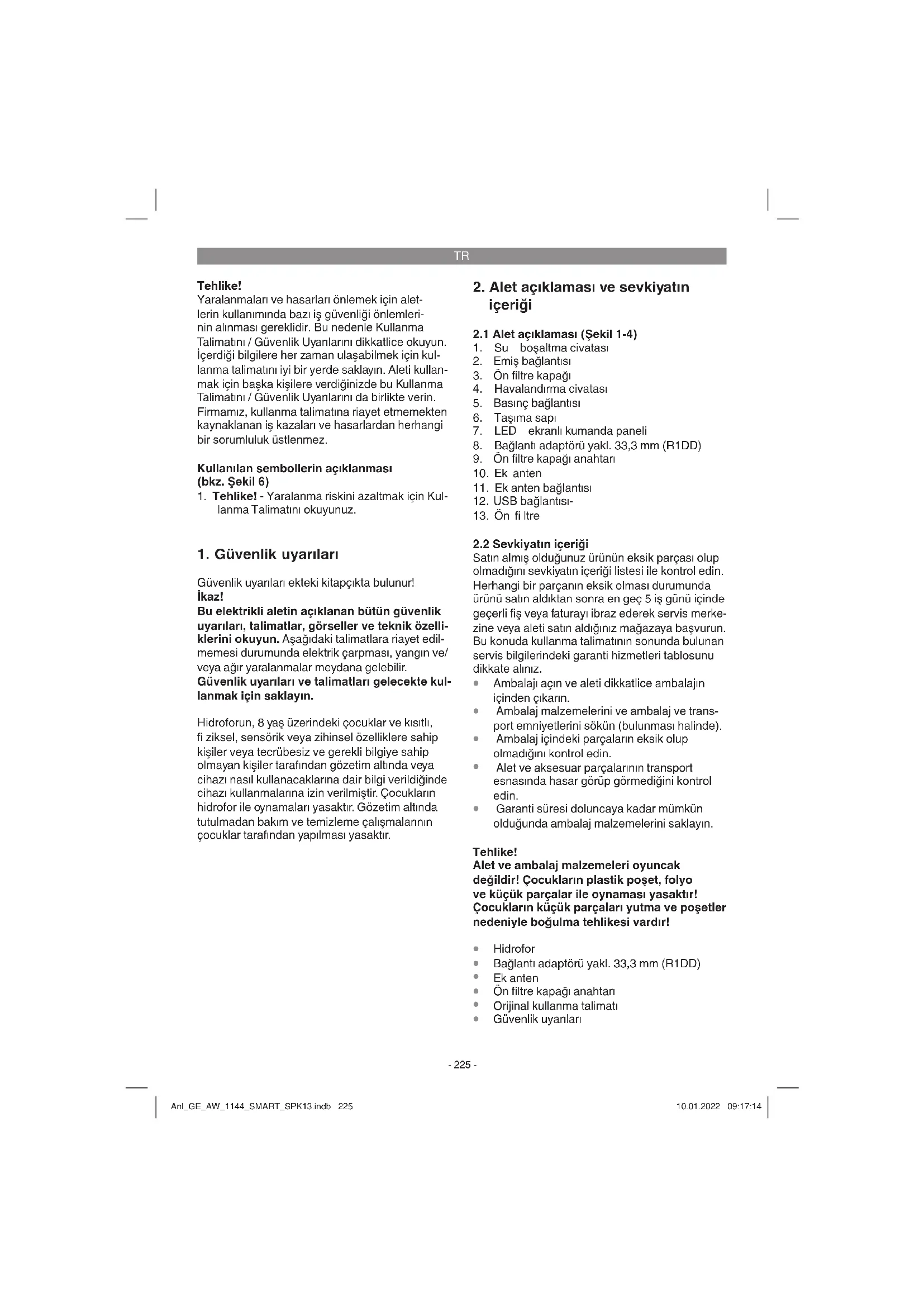 Transport hasarlarını önlemek için alet bir amba- laj içinde sevk edilir. Bu ambalaj hammaddedir ve böylece geri kazanılabilir veya geri kazanım sistemine iade edilebilir. Alet ve aksesuarları örneğin metal ve plastik gibi çeşitli malzemeler- den meydana gelir. Arızalı parçaları evsel atıkların atıldığı çöpe atmayın. Alet, yönetmeliklere uygun şekilde bertaraf edilmesi için özel atık toplama merkezlerine teslim edilmelidir. Bu atık toplama merkezlerinin nerede olduğunu yerel yönetimler- den öğrenebilirsiniz. Anl_GE_AW_1144_SMART_SPK13.indb 230Anl_GE_AW_1144_SMART_SPK13.indb 230 10.01.2022 09:17:1410.01.2022 09:17:14TR