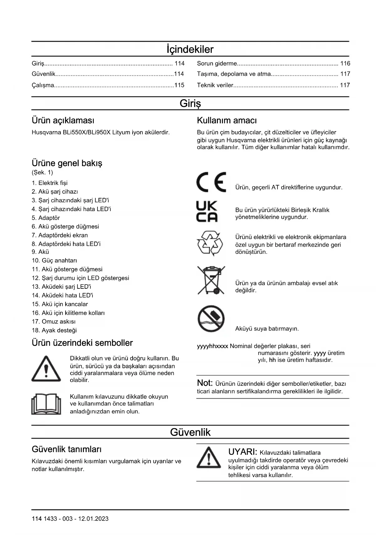 - Om du vill ha mer information om hur du återvinner och kasserar produkten kontaktar du en lokal Husqvarna-återförsäljare. Tekniska data Tekniska data finns på typskylten på batteriet. 1433 - 003 - 12.01.2023 113İçindekiler Giriş............................................................................ 114 Güvenlik......................................................................114 Çalışma.......................................................................115 Sorun giderme............................................................ 116 Taşıma, depolama ve atma........................................ 117 Teknik veriler.............................................................. 117 Giriş Ürün açıklaması Husqvarna BLi550X/BLi950X Lityum iyon akülerdir. Kullanım amacı Bu ürün çim budayıcılar, çit düzelticiler ve üfleyiciler gibi uygun Husqvarna elektrikli ürünleri için güç kaynağı olarak kullanılır. Tüm diğer kullanımlar hatalı kullanımdır. Ürüne genel bakış (Şek. 1)