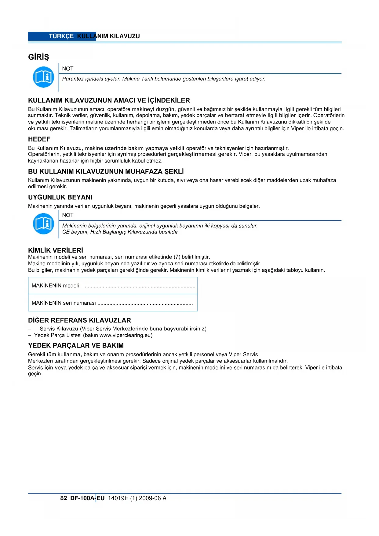 Bu Kullanım Kılavuzunun amacı, operatöre makineyi düzgün, güvenli ve bağımsız bir Ģekilde kullanmayla ilgili gerekli tüm bilgileri sunmaktır. Teknik veriler, güvenlik, kullanım, depolama, bakım, yedek parçalar ve bertaraf etmeyle ilgili bilgiler içerir. Operatörlerin ve yetkili teknisyenlerin makine üzerinde herhangi bir iĢlemi gerçekleĢtirmeden önce bu Kullanım Kılavuzunu dikkatli bir Ģekilde okuması gerekir. Talimatların yorumlanmasıyla ilgili emin olmadığınız konularda veya daha ayrıntılı bilgiler için Viper ile irtibata geçin. HEDEF Bu Kullanım Kılavuzu, makine üzerinde bakım yapmaya yetkili operatör ve teknisyenler için hazırlanmıĢtır. Operatörlerin, yetkili teknisyenler için ayrılmıĢ prosedürleri gerçekleĢtirmemesi gerekir. Viper, bu yasaklara uyulmamasından kaynaklanan hasarlar için hiçbir sorumluluk kabul etmez. BU KULLANIM KILAVUZUNUN MUHAFAZA ġEKLĠ Kullanım Kılavuzunun makinenin yakınında, uygun bir kutuda, sıvı veya ona hasar verebilecek diğer maddelerden uzak muhafaza edilmesi gerekir. UYGUNLUK BEYANI Makinenin yanında verilen uygunluk beyanı, makinenin geçerli yasalara uygun olduğunu belgeler. NOT Makinenin belgelerinin yanında, orijinal uygunluk beyanının iki kopyası da sunulur. CE beyanı, Hızlı Başlangıç Kılavuzunda basılıdır
