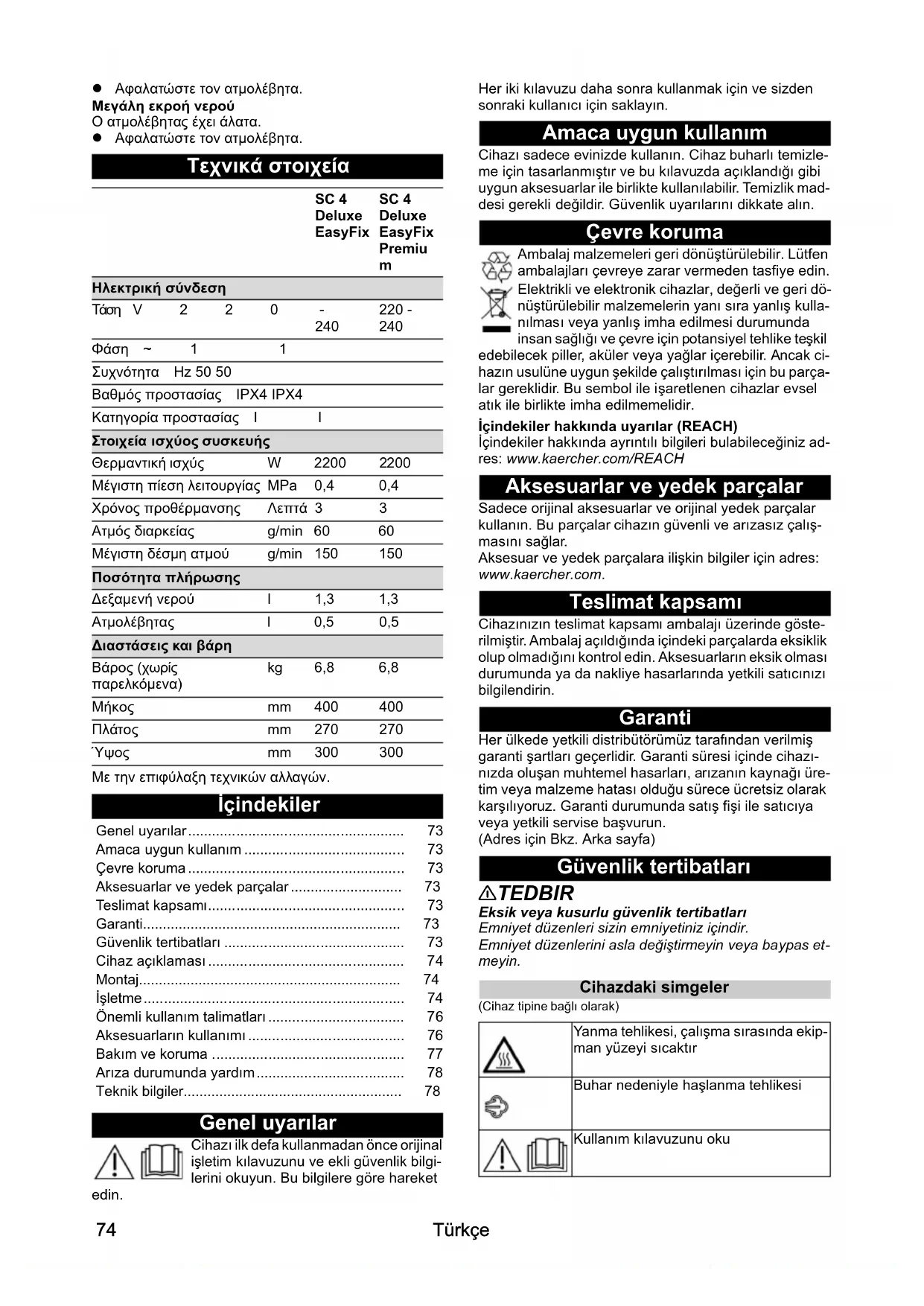 Αφαλατώστε τον ατμολέβητα. Μεγάλη εκροή νερού Ο ατμολέβητας έχει άλατα. Αφαλατώστε τον ατμολέβητα. Τεχνικά στοιχεία Με την επιφύλαξη τεχνικών αλλαγών. İçindekiler Genel uyarılar Cihazı ilk defa kullanmadan önce orijinal işletim kılavuzunu ve ekli güvenlik bilgi- lerini okuyun. Bu bilgilere göre hareket edin. Her iki kılavuzu daha sonra kullanmak için ve sizden sonraki kullanıcı için saklayın. Amaca uygun kullanım Cihazı sadece evinizde kullanın. Cihaz buharlı temizle- me için tasarlanmıştır ve bu kılavuzda açıklandığı gibi uygun aksesuarlar ile birlikte kullanılabilir. Temizlik mad- desi gerekli değildir. Güvenlik uyarılarını dikkate alın. Çevre koruma Ambalaj malzemeleri geri dönüştürülebilir. Lütfen ambalajları çevreye zarar vermeden tasfiye edin. Elektrikli ve elektronik cihazlar, değerli ve geri dö- nüştürülebilir malzemelerin yanı sıra yanlış kulla- nılması veya yanlış imha edilmesi durumunda insan sağlığı ve çevre için potansiyel tehlike teşkil edebilecek piller, aküler veya yağlar içerebilir. Ancak ci- hazın usulüne uygun şekilde çalıştırılması için bu parça- lar gereklidir. Bu sembol ile işaretlenen cihazlar evsel atık ile birlikte imha edilmemelidir. İçindekiler hakkında uyarılar (REACH) İçindekiler hakkında ayrıntılı bilgileri bulabileceğiniz ad- res: www.kaercher.com/REACH Aksesuarlar ve yedek parçalar Sadece orijinal aksesuarlar ve orijinal yedek parçalar kullanın. Bu parçalar cihazın güvenli ve arızasız çalış- masını sağlar. Aksesuar ve yedek parçalara ilişkin bilgiler için adres: www.kaercher.com. Teslimat kapsamı Cihazınızın teslimat kapsamı ambalajı üzerinde göste- rilmiştir. Ambalaj açıldığında içindeki parçalarda eksiklik olup olmadığını kontrol edin. Aksesuarların eksik olması durumunda ya da nakliye hasarlarında yetkili satıcınızı bilgilendirin. Garanti Her ülkede yetkili distribütörümüz tarafından verilmiş garanti şartları geçerlidir. Garanti süresi içinde cihazı- nızda oluşan muhtemel hasarları, arızanın kaynağı üre- tim veya malzeme hatası olduğu sürece ücretsiz olarak karşılıyoruz. Garanti durumunda satış fişi ile satıcıya veya yetkili servise başvurun. (Adres için Bkz. Arka sayfa) Güvenlik tertibatları 몇 TEDBIR Eksik veya kusurlu güvenlik tertibatları Emniyet düzenleri sizin emniyetiniz içindir. Emniyet düzenlerini asla değiştirmeyin veya baypas et- meyin. Cihazdaki simgeler (Cihaz tipine bağlı olarak) SC 4 Deluxe EasyFix SC 4 Deluxe EasyFix Premiu
