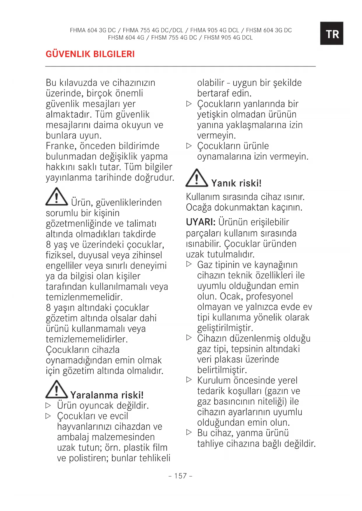 Bu kılavuzda ve cihazı nızı n üzerinde, birçok önemli güvenlik mesajları yer almaktadır. Tüm güvenlik mesajlarını daima okuyun ve bunlara uyun. Franke, önceden bildirimde bulunmadan değişiklik yapma hakkını saklı tutar. Tüm bilgiler yayınlanma tarihinde doğrudur. Ürün, güvenliklerinden sorumlu bir kişinin gözetmenliğinde ve talimatı altında olmadıkları takdirde 8 yaş ve üzerindeki çocuklar, fiziksel, duyusal veya zihinsel engelliler veya sınırlı deneyimi ya da bilgisi olan kişiler tarafından kullanılmamalı veya temizlenmemelidir. 8 yaşın altındaki çocuklar gözetim altında olsalar dahi ürünü kullanmamalı veya temizlememelidirler. Çocukların cihazla oynamadığından emin olmak için gözetim altında olmalıdır. Yaralanma riski!