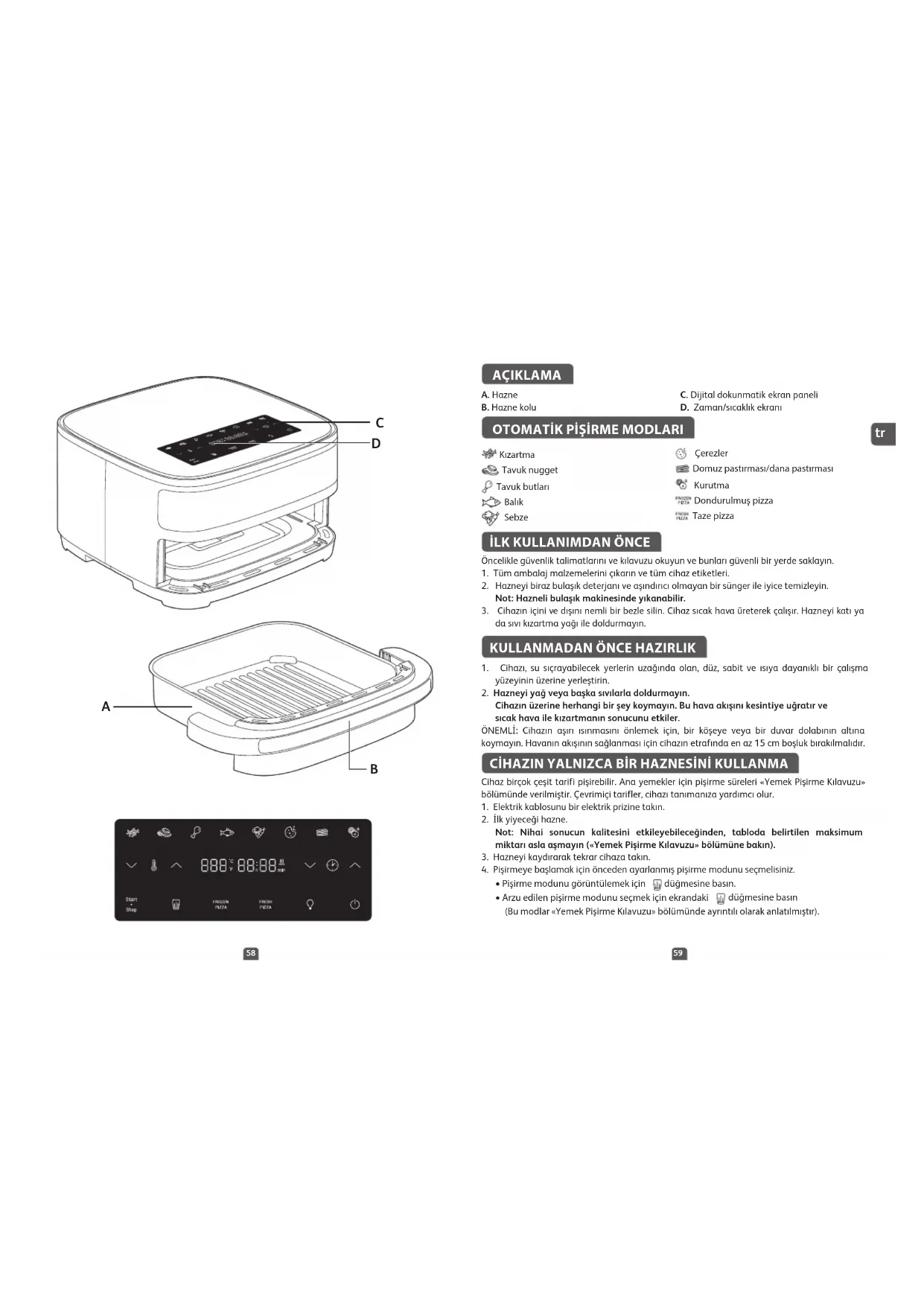 - Cihazı yiyecekleri yeniden ısıtmak için de kullanabilirsiniz. Yiyecekleri tekrar ısıtmak için sıcaklığı 10 dakikaya kadar 160°C olarak ayarlayın. Yiyeceği tamamen yeniden ısıtmak için pişirme süresi yiyecek miktarına göre ayarlanabilir.
