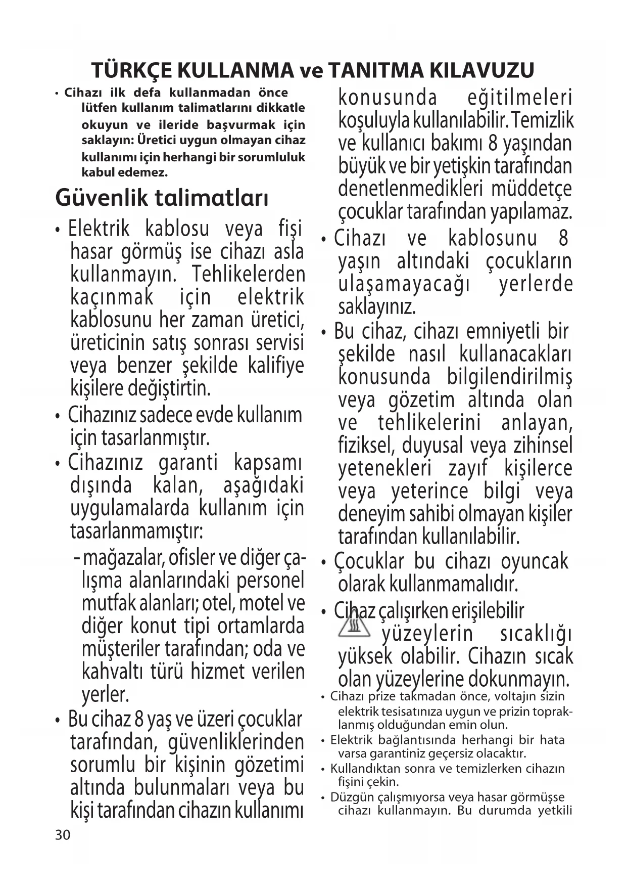 - Bu cihaz 8 yaş ve üzeri çocuklar tarafından, güvenliklerinden sorumlu bir kişinin gözetimi altında bulunmaları veya bu kişi tarafından cihazın kullanımı konusunda eğitilmeleri koşuluyla kullanılabilir. Temizlik ve kullanıcı bakımı 8 yaşından büyük ve bir yetişkin tarafından denetlenmedikleri müddetçe çocuklar tarafından yapılamaz.