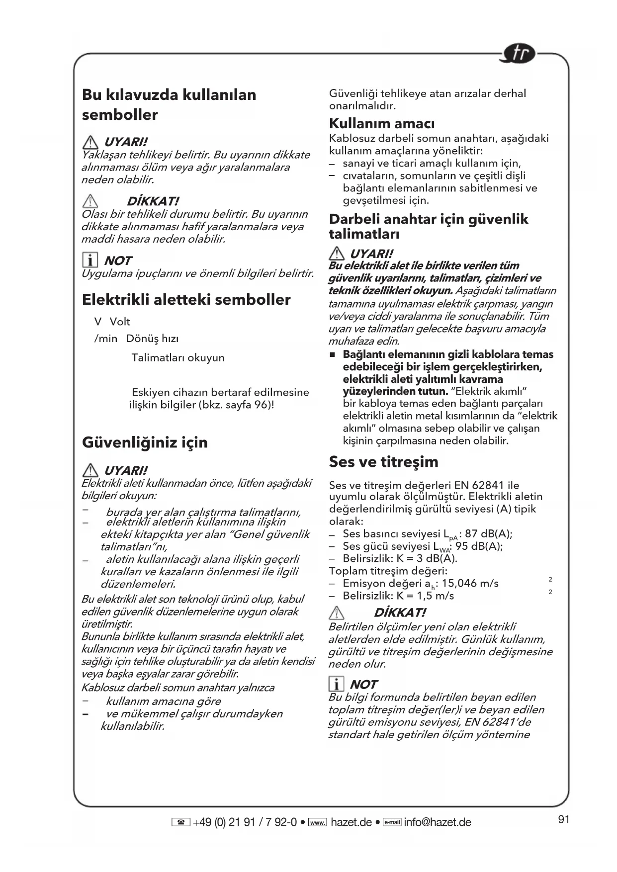 +49 (0) 21 91 / 7 92-0 • hazet.de • info@hazet.de Bu kılavuzda kullanılan semboller UYARI! Yaklaşan tehlikeyi belirtir. Bu uyarının dikkate alınmaması ölüm veya ağır yaralanmalara neden olabilir. DİKKAT! Olası bir tehlikeli durumu belirtir. Bu uyarının dikkate alınmaması hafif yaralanmalara veya maddi hasara neden olabilir. NOT Uygulama ipuçlarını ve önemli bilgileri belirtir. Elektrikli aletteki semboller V Volt /min Dönüş hızı Talimatları okuyun Eskiyen cihazın bertaraf edilmesine ilişkin bilgiler (bkz. sayfa 96)! Güvenliğiniz için UYARI! Elektrikli aleti kullanmadan önce, lütfen aşağıdaki bilgileri okuyun: burada yer alan çalıştırma talimatlarını, elektrikli aletlerin kullanımına ilişkin ekteki kitapçıkta yer alan “Genel güvenlik talimatları”nı, aletin kullanılacağı alana ilişkin geçerli kuralları ve kazaların önlenmesi ile ilgili düzenlemeleri. Bu elektrikli alet son teknoloji ürünü olup, kabul edilen güvenlik düzenlemelerine uygun olarak üretilmiştir. Bununla birlikte kullanım sırasında elektrikli alet, kullanıcının veya bir üçüncü tarafın hayatı ve sağlığı için tehlike oluşturabilir ya da aletin kendisi veya başka eşyalar zarar görebilir. Kablosuz darbeli somun anahtarı yalnızca kullanım amacına göre ve mükemmel çalışır durumdayken kullanılabilir. Güvenliği tehlikeye atan arızalar derhal onarılmalıdır. Kullanım amacı Kablosuz darbeli somun anahtarı, aşağıdaki kullanım amaçlarına yöneliktir: sanayi ve ticari amaçlı kullanım için, cıvataların, somunların ve çeşitli dişlibağlantı elemanlarının sabitlenmesi vegevşetilmesi için. Darbeli anahtar için güvenlik talimatları UYARI! Bu elektrikli alet ile birlikte verilen tüm güvenlik uyarılarını, talimatları, çizimleri ve teknik özellikleri okuyun. Aşağıdaki talimatların tamamına uyulmaması elektrik çarpması, yangın ve/veya ciddi yaralanma ile sonuçlanabilir. Tüm uyarı ve talimatları gelecekte başvuru amacıyla muhafaza edin.