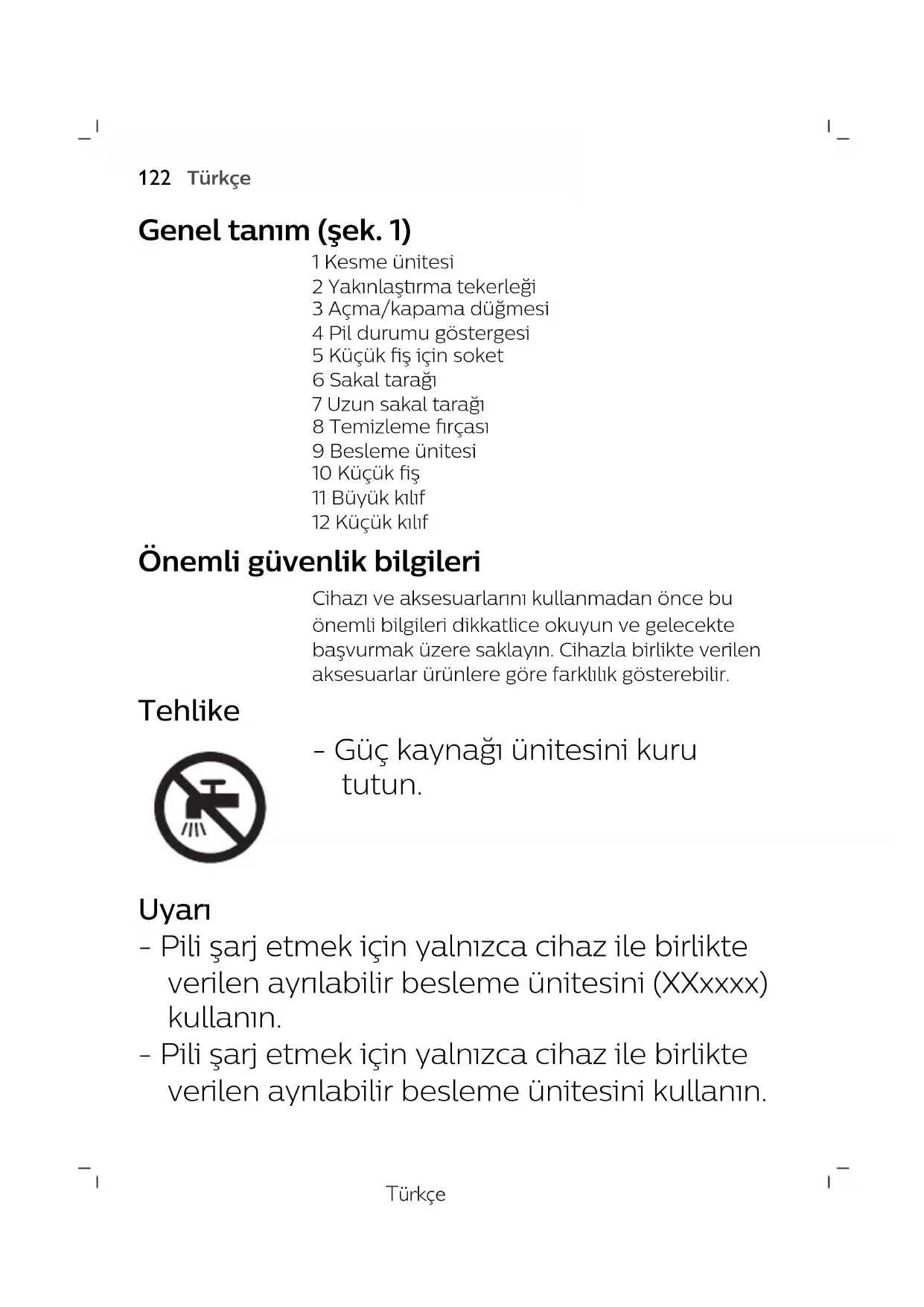 SvenskaTürkçe Genel tanım (şek. 1) 1 Kesme ünitesi 2 Yakınlaştırma tekerleği 3 Açma/kapama düğmesi 4 Pil durumu göstergesi 5 Küçük fiş için soket 6 Sakal tarağı 7 Uzun sakal tarağı 8 Temizleme fırçası 9 Besleme ünitesi 10 Küçük fiş 11 Büyük kılıf 12 Küçük kılıf Önemli güvenlik bilgileri Cihazı ve aksesuarlarını kullanmadan önce bu önemli bilgileri dikkatlice okuyun ve gelecekte başvurmak üzere saklayın. Cihazla birlikte verilen aksesuarlar ürünlere göre farklılık gösterebilir. Tehlike - Güç kaynağı ünitesini kuru tutun. Uyarı - Pili şarj etmek için yalnızca cihaz ile birlikte verilen ayrılabilir besleme ünitesini (XXxxxx) kullanın. - Pili şarj etmek için yalnızca cihaz ile birlikte verilen ayrılabilir besleme ünitesini kullanın.