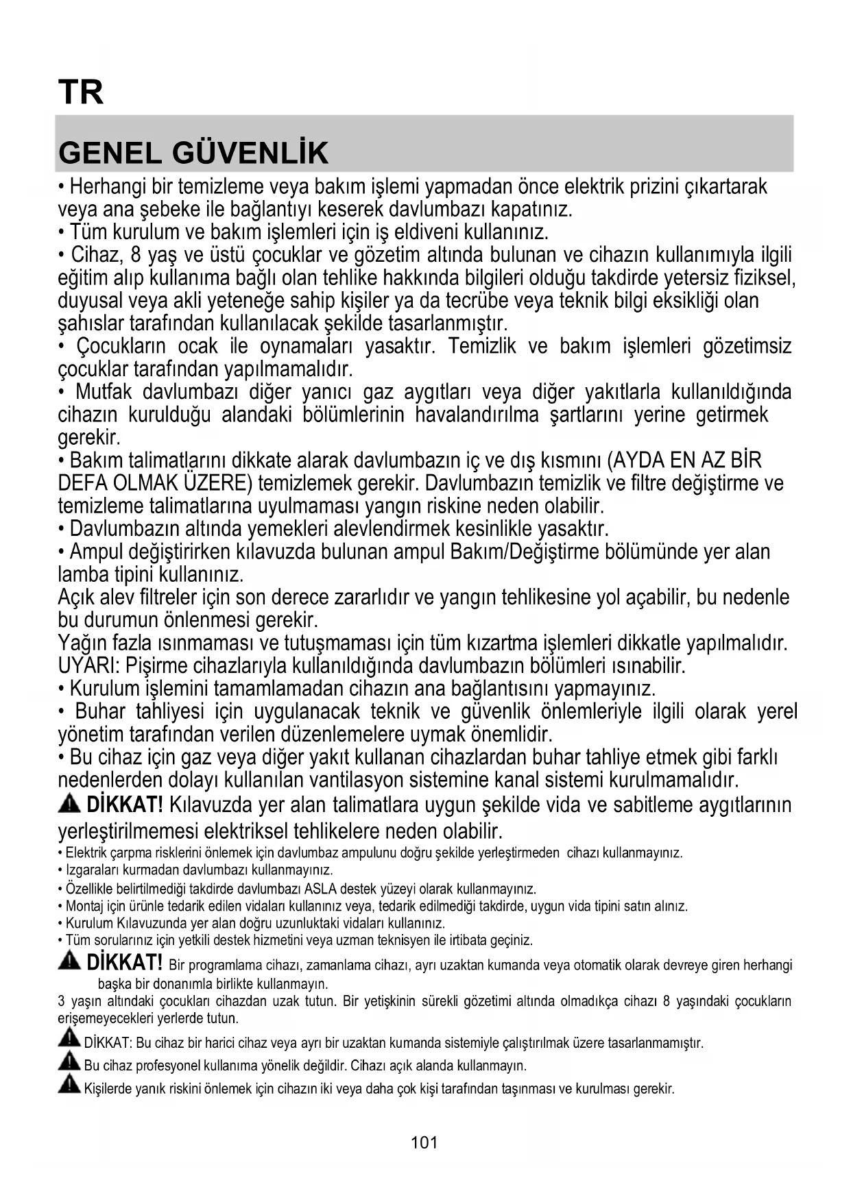 - Elektrik çarpma risklerini önlemek için davlumbaz ampulunu doğru şekilde yerleştirmeden cihazı kullanmayınız.