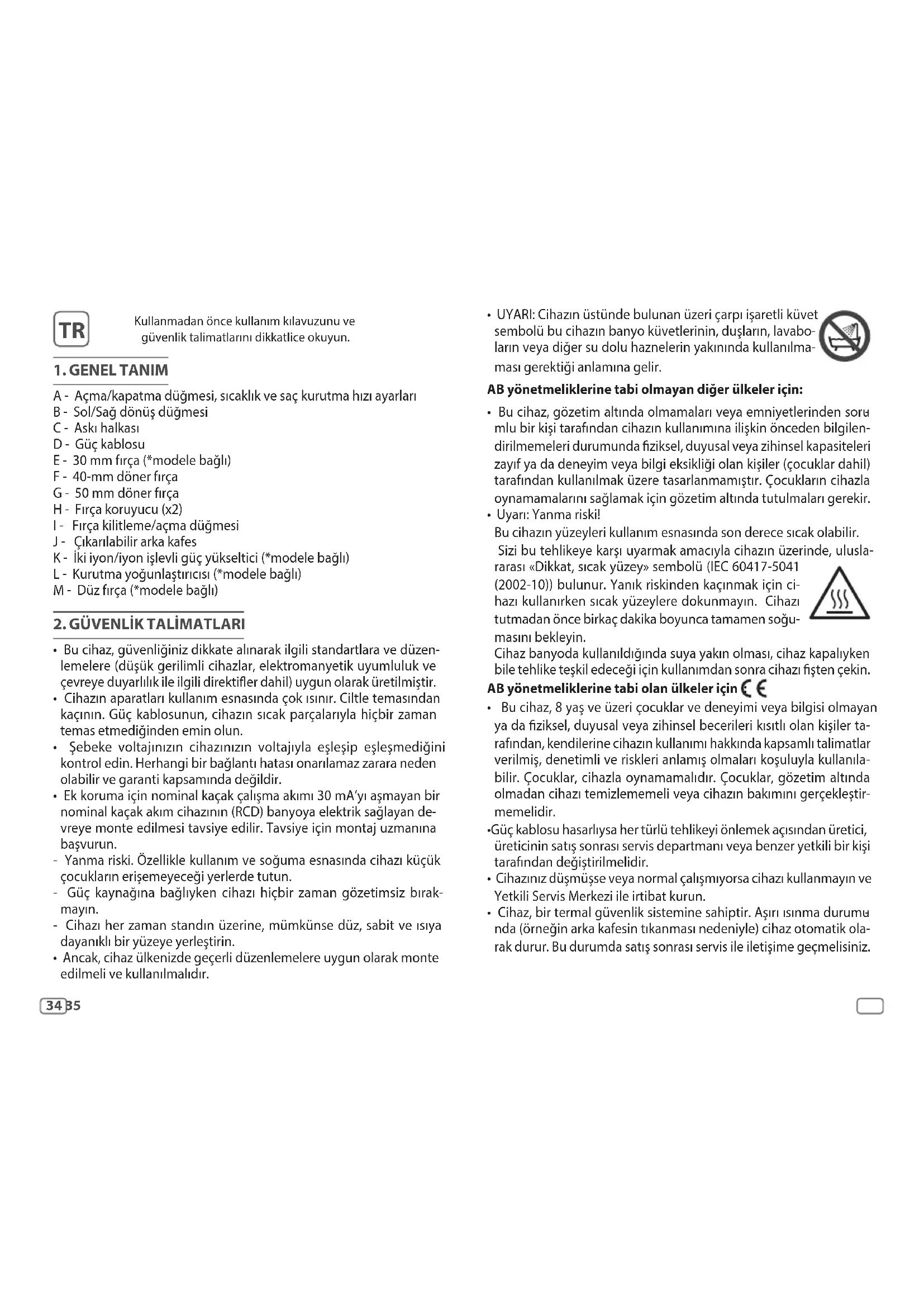 - UYARI: Cihazın üstünde bulunan üzeri çarpı işaretli küvet sembolü bu cihazın banyo küvetlerinin, duşların, lavabo- ların veya diğer su dolu haznelerin yakınında kullanılma- ması gerektiği anlamına gelir. AB yönetmeliklerine tabi olmayan diğer ülkeler için: