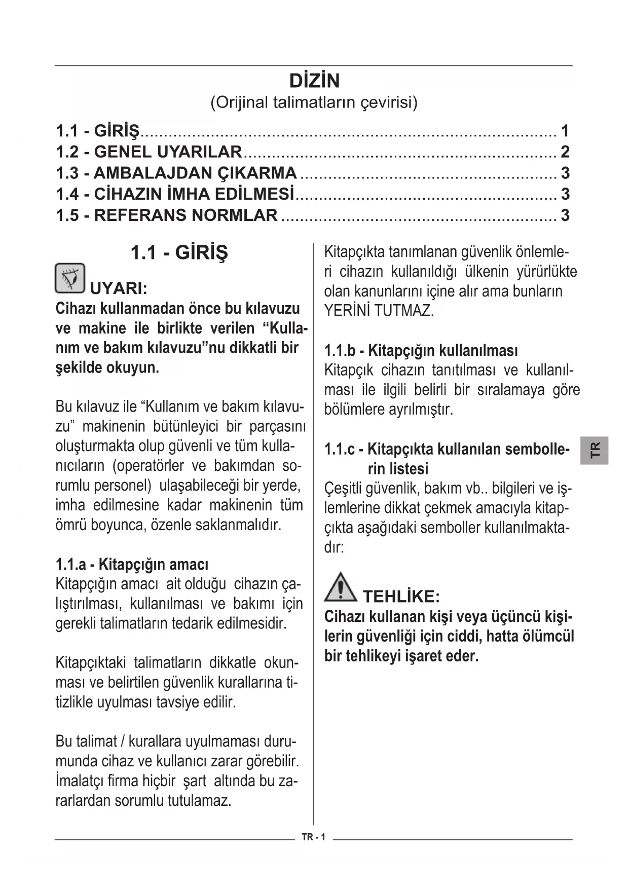 UYARI: Cihazı kullanmadan önce bu kılavuzu ve makine ile birlikte verilen “Kulla- nım ve bakım kılavuzu”nu dikkatli bir şekilde okuyun. Bu kılavuz ile “Kullanım ve bakım kılavu- zu” makinenin bütünleyici bir parçasını oluşturmakta olup güvenli ve tüm kulla- nıcıların (operatörler ve bakımdan so- rumlu personel) ulaşabileceği bir yerde, imha edilmesine kadar makinenin tüm ömrü boyunca, özenle saklanmalıdır.