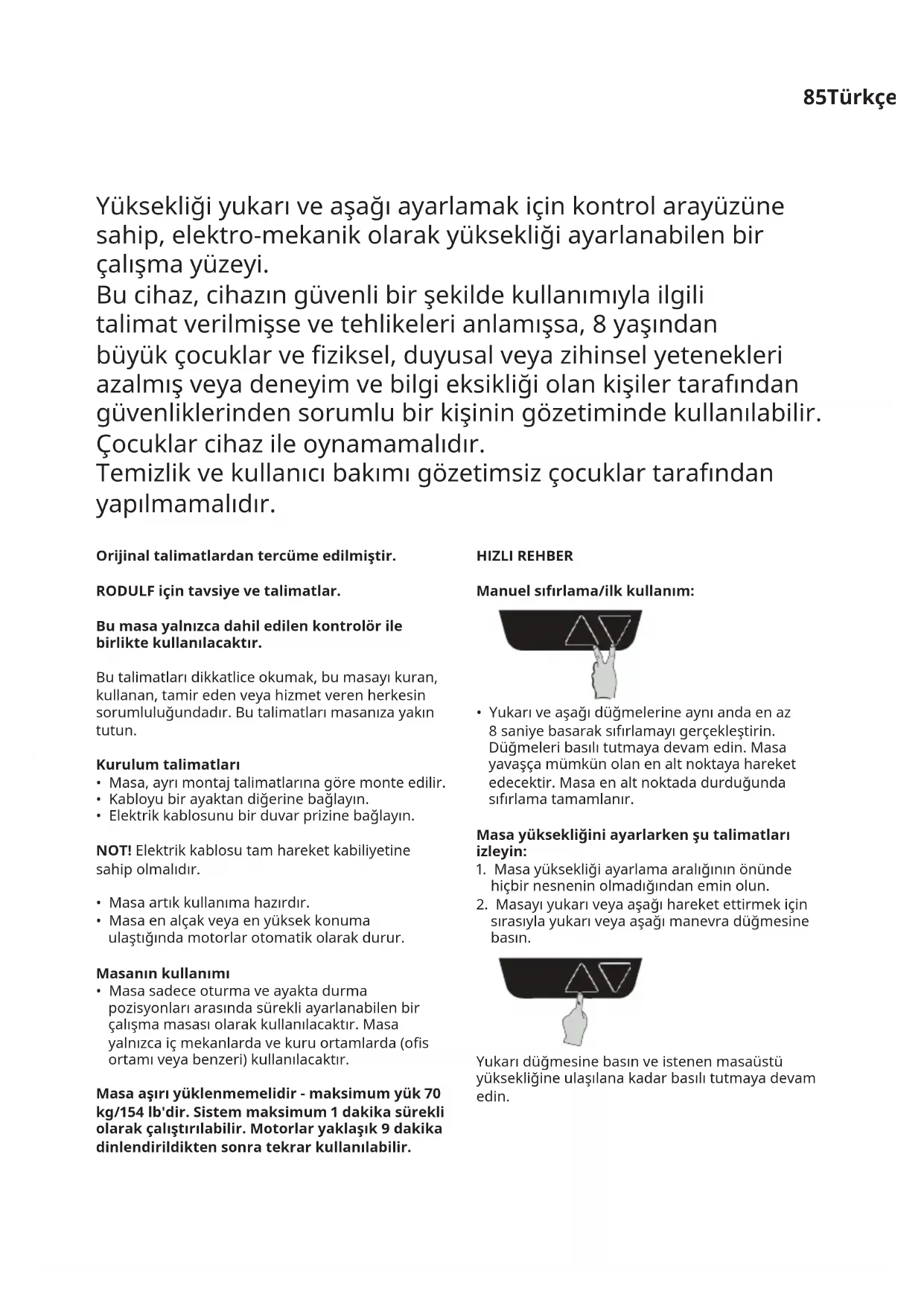 - Masa sadece oturma ve ayakta durma pozisyonları arasında sürekli ayarlanabilen bir çalışma masası olarak kullanılacaktır. Masa yalnızca iç mekanlarda ve kuru ortamlarda (os ortamı veya benzeri) kullanılacaktır. Masaaşırıyüklenmemelidir-maksimumyük70 kg/154lb'dir.Sistemmaksimum1dakikasürekli olarakçalıştırılabilir.Motorlaryaklaşık9dakika dinlendirildiktensonratekrarkullanılabilir. HIZLIREHBER Manuelsıfırlama/ilkkullanım: