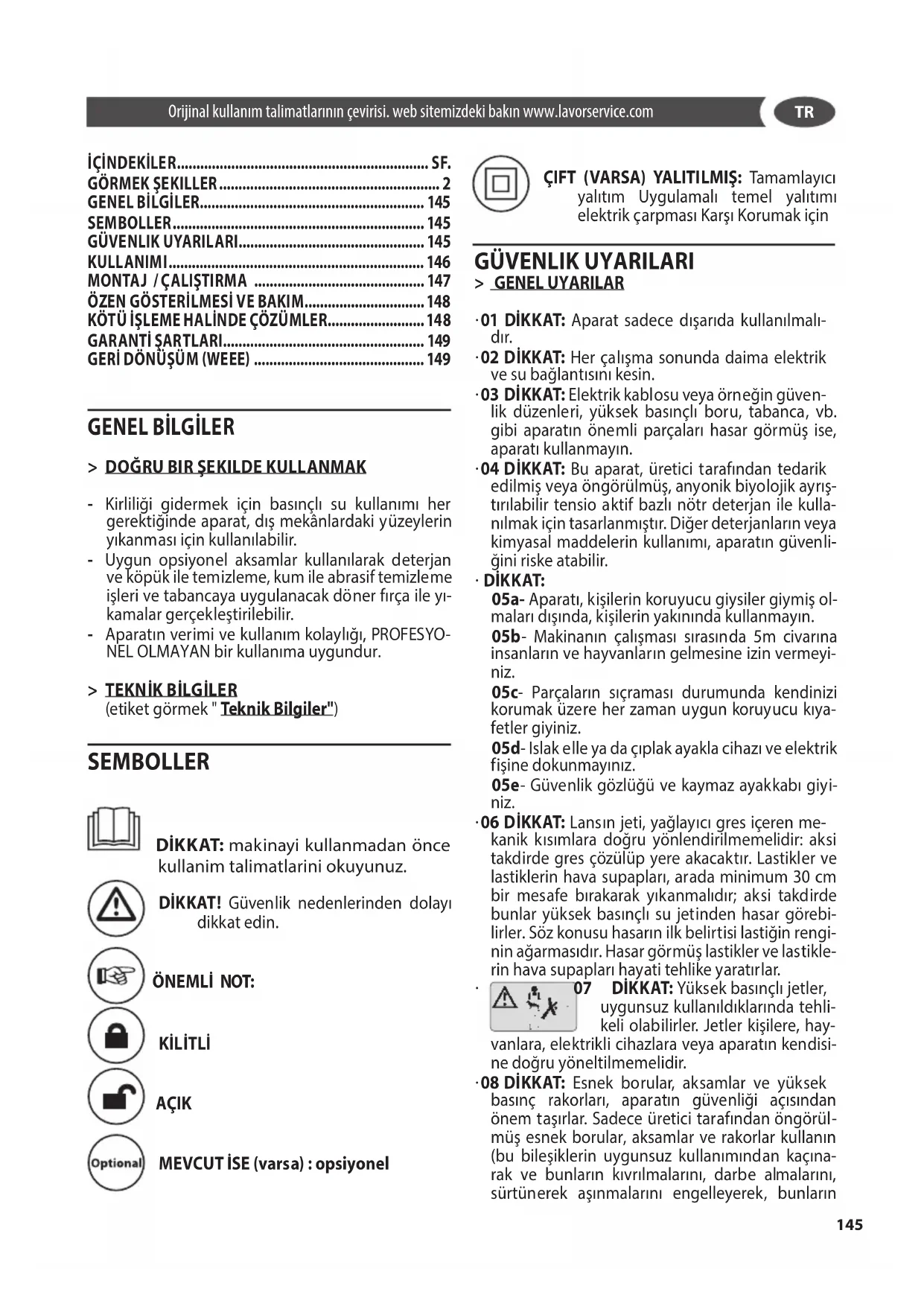 - 08 DİKKAT: Esnek borular, aksamlar ve yüksek basınç rakorları, aparatın güvenliği açısından önem taşırlar. Sadece üretici tarafından öngörül- müş esnek borular, aksamlar ve rakorlar kullanın (bu bileşiklerin uygunsuz kullanımından kaçına- rak ve bunların kıvrılmalarını, darbe almalarını , sürtünerek aşınmalarını engelleyerek, bunların Orijinal kullanım talimatlarının çevirisi. web sitemizdeki bakın www.lavorservice.com İÇİNDEKİLER ................................................................. SF.