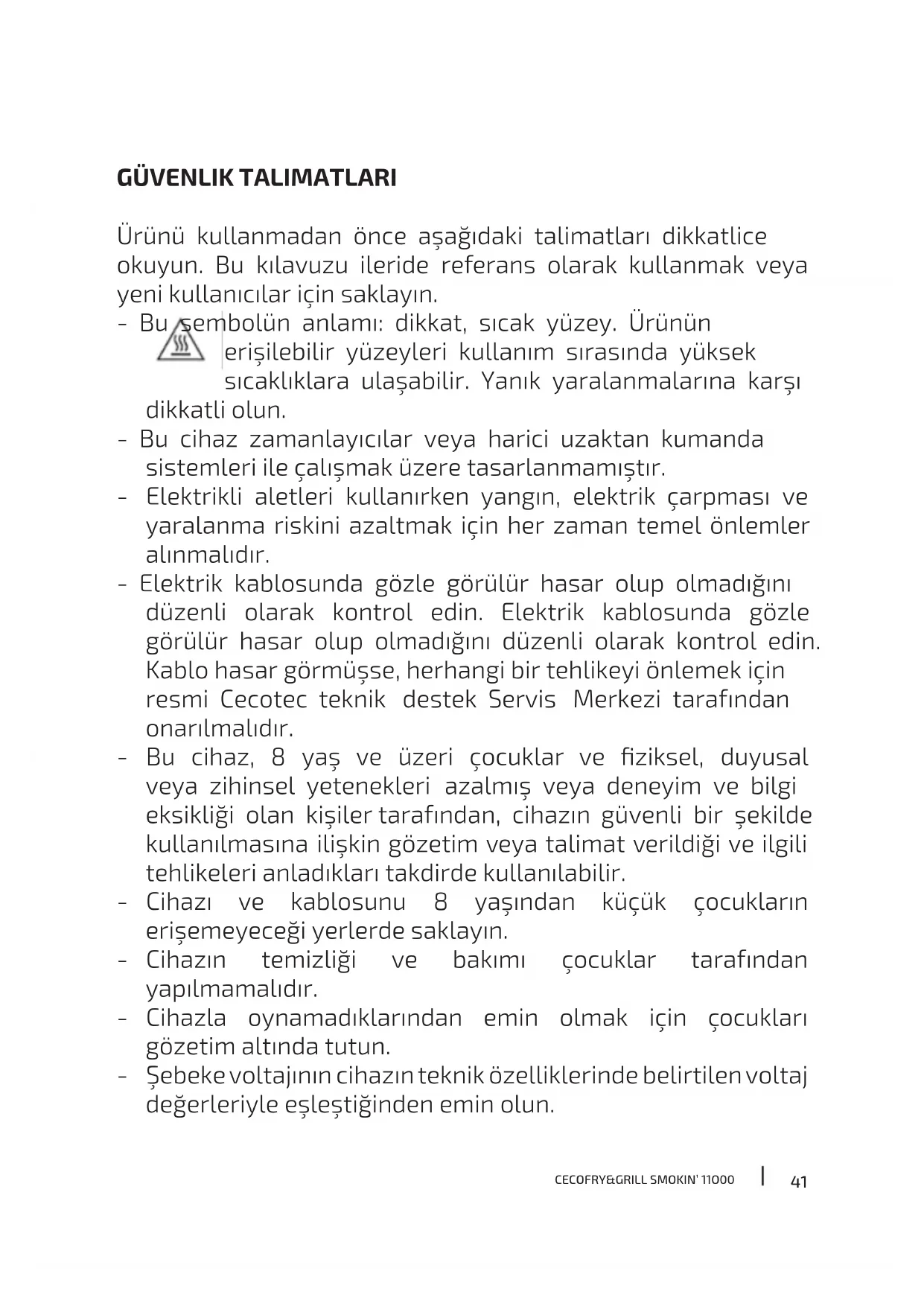 Ürünü kullanmadan önce aşağıdaki talimatları dikkatlice okuyun. Bu kılavuzu ileride referans olarak kullanmak veya yeni kullanıcılar için saklayın. - Bu sembolün anlamı: dikkat, sıcak yüzey. Ürünün erişilebilir yüzeyleri kullanım sırasında yüksek sıcaklıklara ulaşabilir. Yanık yaralanmalarına karşı dikkatli olun. - Bu cihaz zamanlayıcılar veya harici uzaktan kumanda sistemleri ile çalışmak üzere tasarlanmamıştır. - Elektrikli aletleri kullanırken yangın, elektrik çarpması ve yaralanma riskini azaltmak için her zaman temel önlemler alınmalıdır. - Elektrik kablosunda gözle görülür hasar olup olmadığını düzenli olarak kontrol edin. Elektrik kablosunda gözle görülür hasar olup olmadığını düzenli olarak kontrol edin. Kablo hasar görmüşse, herhangi bir tehlikeyi önlemek için resmi Cecotec teknik destek Servis Merkezi tarafından onarılmalıdır. - Bu cihaz, 8 yaş ve üzeri çocuklar ve ziksel, duyusal veya zihinsel yetenekleri azalmış veya deneyim ve bilgi eksikliği olan kişiler tarafından, cihazın güvenli bir şekilde kullanılmasına ilişkin gözetim veya talimat verildiği ve ilgili tehlikeleri anladıkları takdirde kullanılabilir. - Cihazı ve kablosunu 8 yaşından küçük çocukların erişemeyeceği yerlerde saklayın. - Cihazın temizliği ve bakımı çocuklar tarafından yapılmamalıdır. - Cihazla oynamadıklarından emin olmak için çocukları gözetim altında tutun. - Şebeke voltajının cihazın teknik özelliklerinde belirtilen voltaj değerleriyle eşleştiğinden emin olun.CECOFRY&GRILL SMOKIN’ 11O00