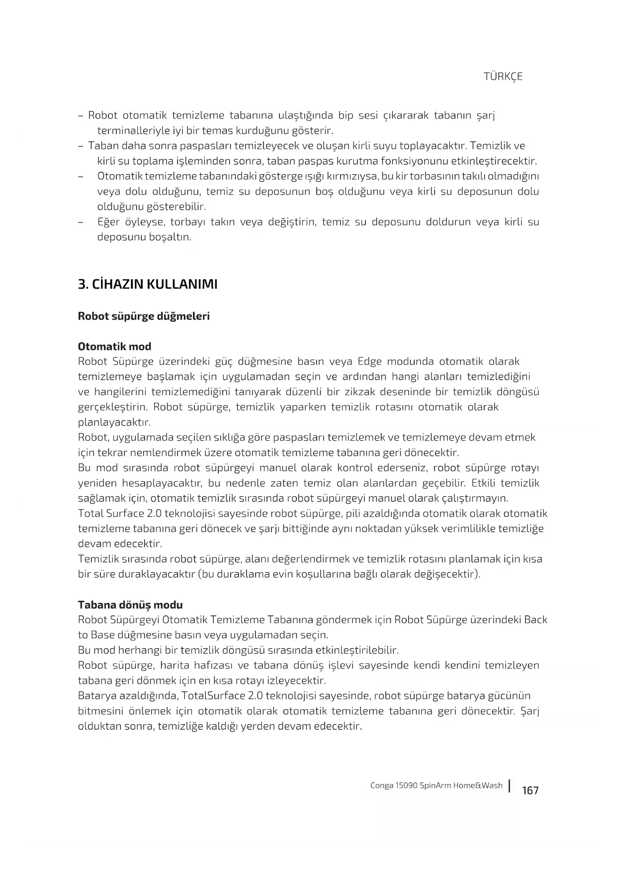 Conga 15090 SpinArm Home&Wash – Robot otomatik temizleme tabanına ulaştığında bip sesi çıkararak tabanın şarj terminalleriyle iyi bir temas kurduğunu gösterir. – Taban daha sonra paspasları temizleyecek ve oluşan kirli suyu toplayacaktır. Temizlik ve kirli su toplama işleminden sonra, taban paspas kurutma fonksiyonunu etkinleştirecektir. – Otomatik temizleme tabanındaki gösterge ışığı kırmızıysa, bu kir torbasının takılı olmadığını veya dolu olduğunu, temiz su deposunun boş olduğunu veya kirli su deposunun dolu olduğunu gösterebilir. – Eğer öyleyse, torbayı takın veya değiştirin, temiz su deposunu doldurun veya kirli su deposunu boşaltın.