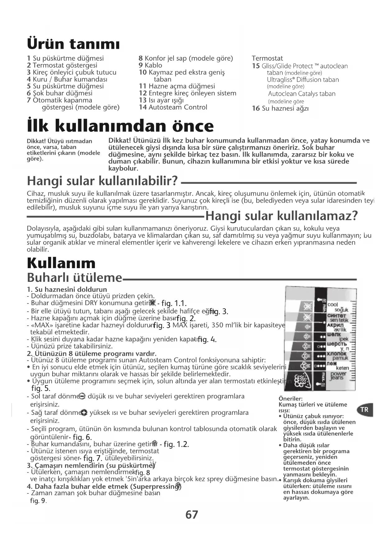 - Nie dzia∏a funkcja spray i/lubsuperpressing.• Pojemnik na wod´ jest pusty. • Nape∏niç pojemnik wodà.•Z przodu ˝elazka wyciekawoda.• Podczas nape∏niania zbiorniczkaprzekroczono poziom MAX.•Wylaç nadmiar ze zbiorniczka. 1800135516 FV95XX E2_110x154 26/01/15 14:46 Page6667 1 Su püskürtme dü¤mesi2 Termostat göstergesi3 Kireç önleyici çubuk tutucu4 Kuru / Buhar kumandas›5 Su püskürtme dü¤mesi6 fiok buhar dü¤mesi7 Otomatik kapanmagöstergesi (modele göre)8 Konfor jel sap (modele göre)9 Kablo10 Kaymaz ped ekstra genifltaban11 Hazne açma dü¤mesi12 Entegre kireç önleyen sistem13 Is› ayar ›fl›¤›14 Autosteam ControlTermostat15 Gliss/Glide Protect ™ autocleantaban (modeline göre)Ultragliss® Diffusion taban(modeline göre)Autoclean Catalys taban(modeline göre16 Su haznesi a¤z› ‹lk kullan›mdan önce Dikkat! Ütünüzü ‹lk kez buhar konumunda kullanmadan önce, yatay konumda veütülenecek giysi d›fl›nda k›sa bir süre çal›flt›rman›z› öneririz. Sok buhardü¤mesine, ayn› flekilde birkaç tez bas›n. ‹lk kullan›mda, zarars›z bir koku veduman ç›kabilir. Bunun, cihaz›n kullan›m›na bir etkisi yoktur ve k›sa süredekaybolur. Hangi sular kullan›labilir? Cihaz, musluk suyu ile kullan›lmak üzere tasarlanm›flt›r. Ancak, kireç oluflumunu önlemek için, ütünün otomatiktemizli¤inin düzenli olarak yap›lmas› gereklidir. Suyunuz çok kireçli ise (bu, belediyeden veya sular idaresinden teyitedilebilir), musluk suyunu içme suyu ile yar› yar›ya kar›flt›r›n. Hangi sular kullan›lamaz? Dolay›s›yla, afla¤›daki gibi sular› kullanmaman›z› öneriyoruz. Giysi kurutuculardan ç›kan su, kokulu veyayumuflat›lm›fl su, buzdolab›, batarya ve klimalardan ç›kan su, saf dam›t›lm›fl su veya ya¤mur suyu kullanmay›n; busular organik at›klar ve mineral elementler içerir ve kahverengi lekelere ve cihaz›n erken y›pranmas›na nedenolabilir. Kullan›m Buharl› ütüleme 1. Su haznesini doldurun- Doldurmadan önce ütüyü prizden çekin.- Buhar dü¤mesini DRY konumuna getirin - fig. 1.1.- Bir elle ütüyü tutun, taban› afla¤› gelecek flekilde hafifçe e¤in - fig. 3.- Hazne kapa¤›n› açmak için dü¤me üzerine bas›n - fig. 2.- «MAX» iflaretine kadar hazneyi doldurun- fig. 3MAX iflareti, 350 ml’lik bir kapasiteyetekabül etmektedir.- Klik sesini duyana kadar hazne kapa¤›n› yeniden kapat›n - fig. 4.- Üünüzü prize takabilirsiniz.2. Ütünüzün 8 ütüleme program› vard›r.- Ütünüz 8 ütüleme program› sunan Autosteam Control fonksiyonuna sahiptir:• En iyi sonucu elde etmek için ütünüz, seçilen kumafl türüne göre s›cakl›k seviyelerini veuygun buhar miktar›n› olarak ve hassas bir flekilde belirlemektedir.• Uygun ütüleme program›n› seçmek için, solun alt›nda yer alan termostat› etkinlefltirin fig. 5.- Sol taraf dönme : düflük ›s› ve buhar seviyeleri gerektiren programlaraeriflirsiniz. - Sa¤ taraf dönme : yüksek ›s› ve buhar seviyeleri gerektiren programlaraeriflirsiniz. - Seçili program, ütünün ön k›sm›nda bulunan kontrol tablosunda otomatik olarakgörüntülenir - fig. 6.- Buhar kumandas›n›, buhar üzerine getirin - fig. 1.2.- Ütünüz istenen ›s›ya eriflti¤inde, termostatgöstergesi söner - fig. 7. ütüleyebilirsiniz.3. Çamafl›r› nemlendirin (su püskürtme) - Ütülerken, çamafl›r› nemlendirmek - fig. 8ve inatç› k›r›fl›kl›klar› yok etmek '5in'arka arkaya birçok kez sprey dü¤mesine bas›n.4. Daha fazla buhar elde etmek (Superpressing) - Zaman zaman flok buhar dü¤mesine bas›n fig. 9 Dikkat! Ütüyü ›s›tmadanönce, varsa, tabanetiketlerini ç›kar›n (modelegöre).Öneriler:Kumafl türleri ve ütüleme›s›s›:• Ütünüz çabuk ›s›n›yor:önce, düflük ›s›da ütülenengiysilerden bafllay›n veyüksek ›s›da ütülenenlerlebitirin.• Daha düflük ›s›largerektiren bir programageçerseniz, yenidenütülemeden öncetermostat göstergesininyanmas›n› bekleyin. • Kar›fl›k dokuma giysileriütülerken: ütüleme ›s›s›n›en hassas dokumaya göreayarlay›n. Ürün tan›m›