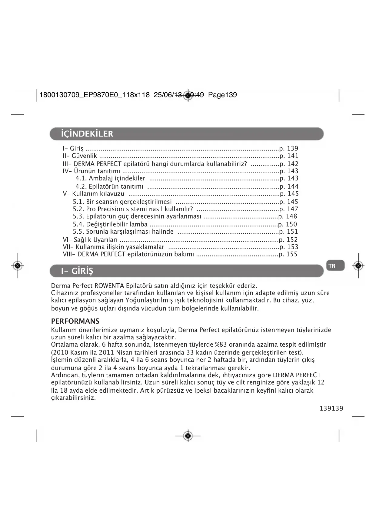 I- Giriş .....................................................................................................p. 139 II- Güvenlik ..............................................................................................p. 141 III- DERMA PERFECT epilatörü hangi durumlarda kullanabiliriz? ...............p. 142 IV- Ürünün tanıtımı ..................................................................................p. 143 4.1. Ambalaj içindekiler ....................................................................p. 143 4.2. Epilatörün tanıtımı .....................................................................p. 144 V- Kullanım kılavuzu ...............................................................................p. 145 5.1. Bir seansın gerçekleştirilmesi ......................................................p. 145 5.2. Pro Precision sistemi nasıl kullanılır? ...........................................p. 147 5.3. Epilatörün güç derecesinin ayarlanması .......................................p. 148 5.4. Değiştirilebilir lamba ...................................................................p. 150 5.5. Sorunla karşılaşılması halinde .....................................................p. 151 VI- Sağlık Uyarıları ...................................................................................p. 152 VII- Kullanıma ilişkin yasaklamalar ..........................................................p. 153 VIII- DERMA PERFECT epilatörünüzün bakımı ...........................................p. 155 Derma Perfect ROWENTA Epilatörü satın aldığınız için teşekkür ederiz. Cihazınız profesyoneller tarafından kullanılan ve kişisel kullanım için adapte edilmiş uzun süre kalıcı epilasyon sağlayan Yoğunlaştırılmış ışık teknolojisini kullanmaktadır. Bu cihaz, yüz, boyun ve göğüs uçları dışında vücudun tüm bölgelerinde kullanılabilir. PERFORMANS Kullanım önerilerimize uymanız koşuluyla, Derma Perfect epilatörünüz istenmeyen tüylerinizde uzun süreli kalıcı bir azalma sağlayacaktır. Ortalama olarak, 6 hafta sonunda, istenmeyen tüylerde %83 oranında azalma tespit edilmiştir (2010 Kasım ila 2011 Nisan tarihleri arasında 33 kadın üzerinde gerçekleştirilen test). İşlemin düzenli aralıklarla, 4 ila 6 seans boyunca her 2 haftada bir, ardından tüylerin çıkış durumuna göre 2 ila 4 seans boyunca ayda 1 tekrarlanması gerekir. Ardından, tüylerin tamamen ortadan kaldırılmalarına dek, ihtiyacınıza göre DERMA PERFECT epilatörünüzü kullanabilirsiniz. Uzun süreli kalıcı sonuç tüy ve cilt renginize göre yaklaşık 12 ila 18 ayda elde edilmektedir. Artık pürüzsüz ve ipeksi bacaklarınızın keyfini kalıcı olarak çıkarabilirsiniz. I-GİRİŞ İÇİNDEKİLER 1800130709_EP9870E0_118x118 25/06/13 10:49 Page139GÜVENLİK Cihazınız bilim adamları ve klinik uzmanları tarafından tasarlanmış ve en yüksek standartlara göre test edilmiştir. Aşağıdaki unsurlar sayesinde cihazınız son derece güvenlidir:
