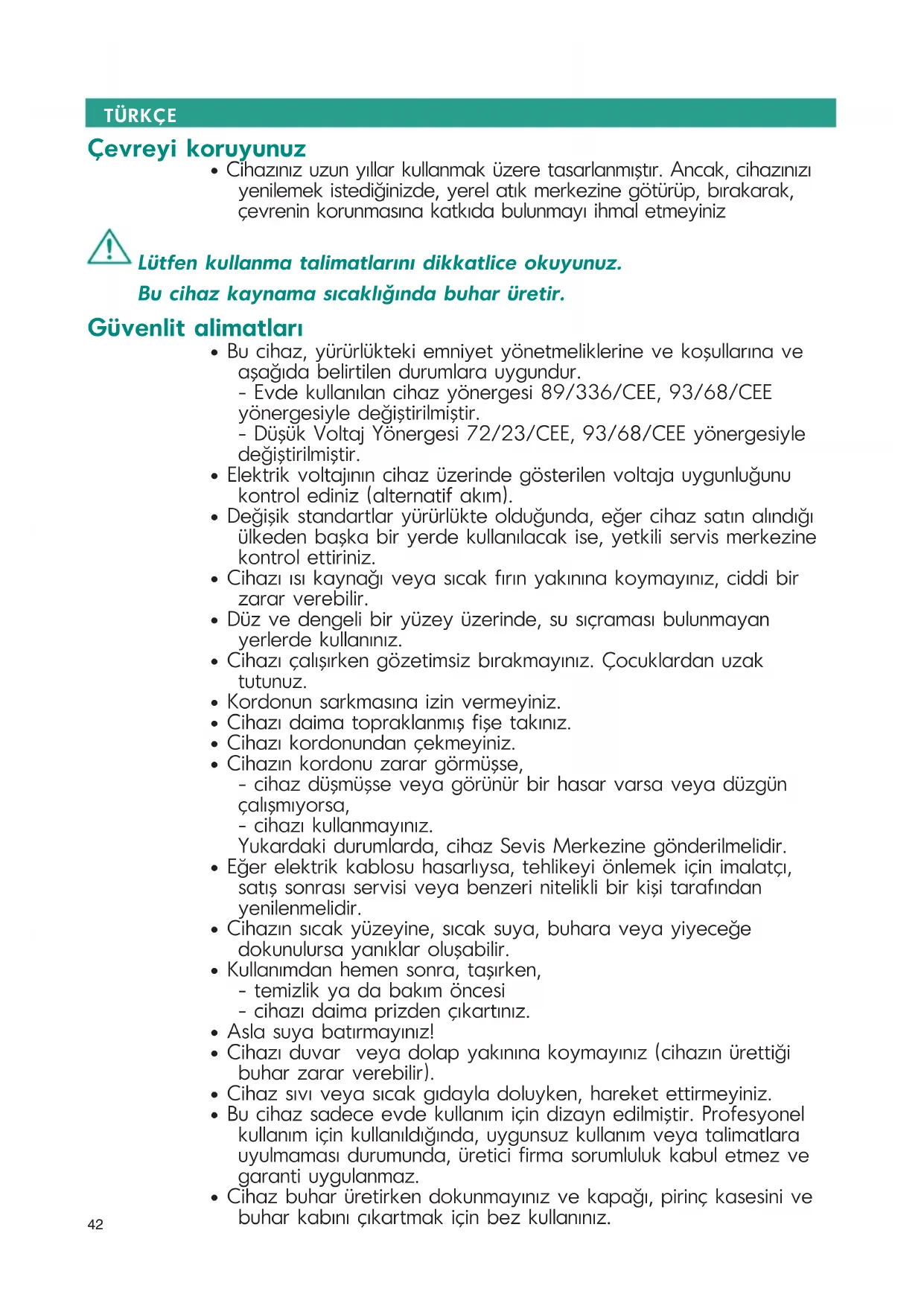 - Cihaznz uzun yllar kullanmak üzere tasarlanmştr. Ancak, cihaznz yenilemek istediğinizde, yerel atk merkezine götürüp, brakarak, çevrenin korunmasna katkda bulunmay ihmal etmeyiniz Lütfen kullanma talimatlarn dikkatlice okuyunuz. Bu cihaz kaynama scaklğnda buhar üretir. Güvenlit alimatlar