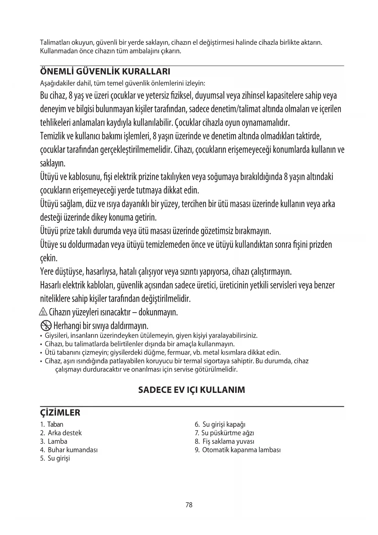 9. Ütüyü, tabanının aşınmasını ve hasar görmesini önlemek için arka desteği üzerinde saklayın.81