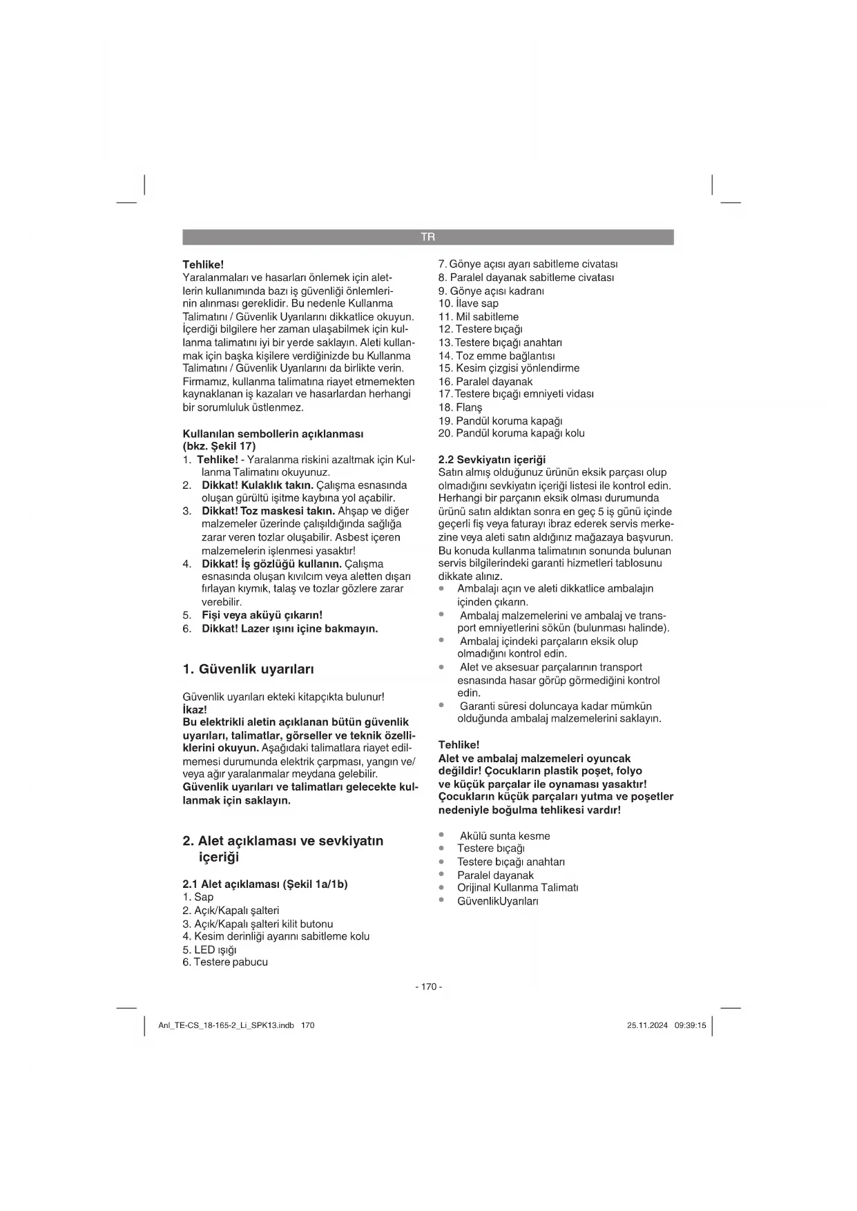 talimatlara göre kullanılmadığında veya bakımı düzgün şekilde yapılmadığında el-kol titreşiminden kaynaklanan sağlık hasarlarının oluşması. Anl_TE-CS_18-165-2_Li_SPK13.indb 171Anl_TE-CS_18-165-2_Li_SPK13.indb 171 25.11.2024 09:39:1525.11.2024 09:39:15TR