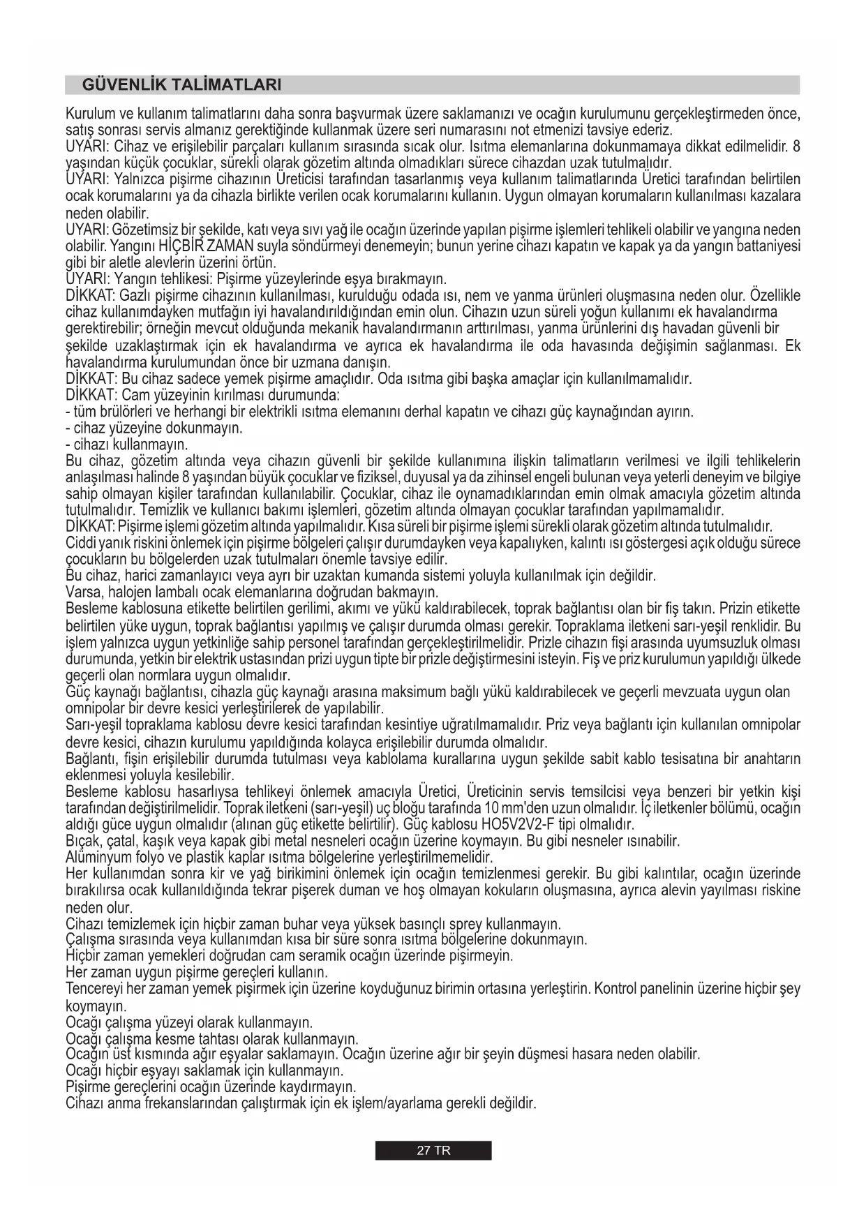 Jeśli to możliwe, użyj pokrywki, aby przykryć patelnię. Reguluj płomień tak, aby nie zachodził na średnicę patelni.27 TR Kurulum ve kullanım talimatlarını daha sonra başvurmak üzere saklamanızı ve ocağın kurulumunu gerçekleştirmeden önce, satış sonrası servis almanız gerektiğinde kullanmak üzere seri numarasını not etmenizi tavsiye ederiz. UYARI: Cihaz ve erişilebilir parçaları kullanım sırasında sıcak olur. Isıtma elemanlarına dokunmamaya dikkat edilmelidir. 8 yaşından küçük çocuklar, sürekli olarak gözetim altında olmadıkları sürece cihazdan uzak tutulmalıdır. UYARI: Yalnızca pişirme cihazının Üreticisi tarafından tasarlanmış veya kullanım talimatlarında Üretici tarafından belirtilen ocak korumalarını ya da cihazla birlikte verilen ocak korumalarını kullanın. Uygun olmayan korumaların kullanılması kazalara neden olabilir. UYARI: Gözetimsiz bir şekilde, katı veya sıvı yağ ile ocağın üzerinde yapılan pişirme işlemleri tehlikeli olabilir ve yangına neden olabilir. Yangını HİÇBİR ZAMAN suyla söndürmeyi denemeyin; bunun yerine cihazı kapatın ve kapak ya da yangın battaniyesi gibi bir aletle alevlerin üzerini örtün. UYARI: Yangın tehlikesi: Pişirme yüzeylerinde eşya bırakmayın. DİKKAT: Gazlı pişirme cihazının kullanılması, kurulduğu odada ısı, nem ve yanma ürünleri oluşmasına neden olur. Özellikle cihaz kullanımdayken mutfağın iyi havalandırıldığından emin olun. Cihazın uzun süreli yoğun kullanımı ek havalandırma gerektirebilir; örneğin mevcut olduğunda mekanik havalandırmanın arttırılması, yanma ürünlerini dış havadan güvenli bir şekilde uzaklaştırmak için ek havalandırma ve ayrıca ek havalandırma ile oda havasında değişimin sağlanması. Ek havalandırma kurulumundan önce bir uzmana danışın. DİKKAT: Bu cihaz sadece yemek pişirme amaçlıdır. Oda ısıtma gibi başka amaçlar için kullanılmamalıdır. DİKKAT: Cam yüzeyinin kırılması durumunda: - tüm brülörleri ve herhangi bir elektrikli ısıtma elemanını derhal kapatın ve cihazı güç kaynağından ayırın. - cihaz yüzeyine dokunmayın. - cihazı kullanmayın. Bu cihaz, gözetim altında veya cihazın güvenli bir şekilde kullanımına ilişkin talimatların verilmesi ve ilgili tehlikelerin anlaşılması halinde 8 yaşından büyük çocuklar ve fiziksel, duyusal ya da zihinsel engeli bulunan veya yeterli deneyim ve bilgiye sahip olmayan kişiler tarafından kullanılabilir. Çocuklar, cihaz ile oynamadıklarından emin olmak amacıyla gözetim altında tutulmalıdır. Temizlik ve kullanıcı bakımı işlemleri, gözetim altında olmayan çocuklar tarafından yapılmamalıdır. DİKKAT: Pişirme işlemi gözetim altında yapılmalıdır. Kısa süreli bir pişirme işlemi sürekli olarak gözetim altında tutulmalıdır. Ciddi yanık riskini önlemek için pişirme bölgeleri çalışır durumdayken veya kapalıyken, kalıntı ısı göstergesi açık olduğu sürece çocukların bu bölgelerden uzak tutulmaları önemle tavsiye edilir. Bu cihaz, harici zamanlayıcı veya ayrı bir uzaktan kumanda sistemi yoluyla kullanılmak için değildir. Varsa, halojen lambalı ocak elemanlarına doğrudan bakmayın. Besleme kablosuna etikette belirtilen gerilimi, akımı ve yükü kaldırabilecek, toprak bağlantısı olan bir fiş takın. Prizin etikette belirtilen yüke uygun, toprak bağlantısı yapılmış ve çalışır durumda olması gerekir. Topraklama iletkeni sarı-yeşil renklidir. Bu işlem yalnızca uygun yetkinliğe sahip personel tarafından gerçekleştirilmelidir. Prizle cihazın fişi arasında uyumsuzluk olması durumunda, yetkin bir elektrik ustasından prizi uygun tipte bir prizle değiştirmesini isteyin. Fiş ve priz kurulumun yapıldığı ülkede geçerli olan normlara uygun olmalıdır. Güç kaynağı bağlantısı, cihazla güç kaynağı arasına maksimum bağlı yükü kaldırabilecek ve geçerli mevzuata uygun olan omnipolar bir devre kesici yerleştirilerek de yapılabilir. Sarı-yeşil topraklama kablosu devre kesici tarafından kesintiye uğratılmamalıdır. Priz veya bağlantı için kullanılan omnipolar devre kesici, cihazın kurulumu yapıldığında kolayca erişilebilir durumda olmalıdır. Bağlantı, fişin erişilebilir durumda tutulması veya kablolama kurallarına uygun şekilde sabit kablo tesisatına bir anahtarın eklenmesi yoluyla kesilebilir. Besleme kablosu hasarlıysa tehlikeyi önlemek amacıyla Üretici, Üreticinin servis temsilcisi veya benzeri bir yetkin kişi tarafından değiştirilmelidir. Toprak iletkeni (sarı-yeşil) uç bloğu tarafında 10 mm'den uzun olmalıdır. İç iletkenler bölümü, ocağın aldığı güce uygun olmalıdır (alınan güç etikette belirtilir). Güç kablosu HO5V2V2-F tipi olmalıdır. Bıçak, çatal, kaşık veya kapak gibi metal nesneleri ocağın üzerine koymayın. Bu gibi nesneler ısınabilir. Alüminyum folyo ve plastik kaplar ısıtma bölgelerine yerleştirilmemelidir. Her kullanımdan sonra kir ve yağ birikimini önlemek için ocağın temizlenmesi gerekir. Bu gibi kalıntılar, ocağın üzerinde bırakılırsa ocak kullanıldığında tekrar pişerek duman ve hoş olmayan kokuların oluşmasına, ayrıca alevin yayılması riskine neden olur. Cihazı temizlemek için hiçbir zaman buhar veya yüksek basınçlı sprey kullanmayın. Çalışma sırasında veya kullanımdan kısa bir süre sonra ısıtma bölgelerine dokunmayın. Hiçbir zaman yemekleri doğrudan cam seramik ocağın üzerinde pişirmeyin. Her zaman uygun pişirme gereçleri kullanın. Tencereyi her zaman yemek pişirmek için üzerine koyduğunuz birimin ortasına yerleştirin. Kontrol panelinin üzerine hiçbir şey koymayın. Ocağı çalışma yüzeyi olarak kullanmayın. Ocağı çalışma kesme tahtası olarak kullanmayın. Ocağın üst kısmında ağır eşyalar saklamayın. Ocağın üzerine a