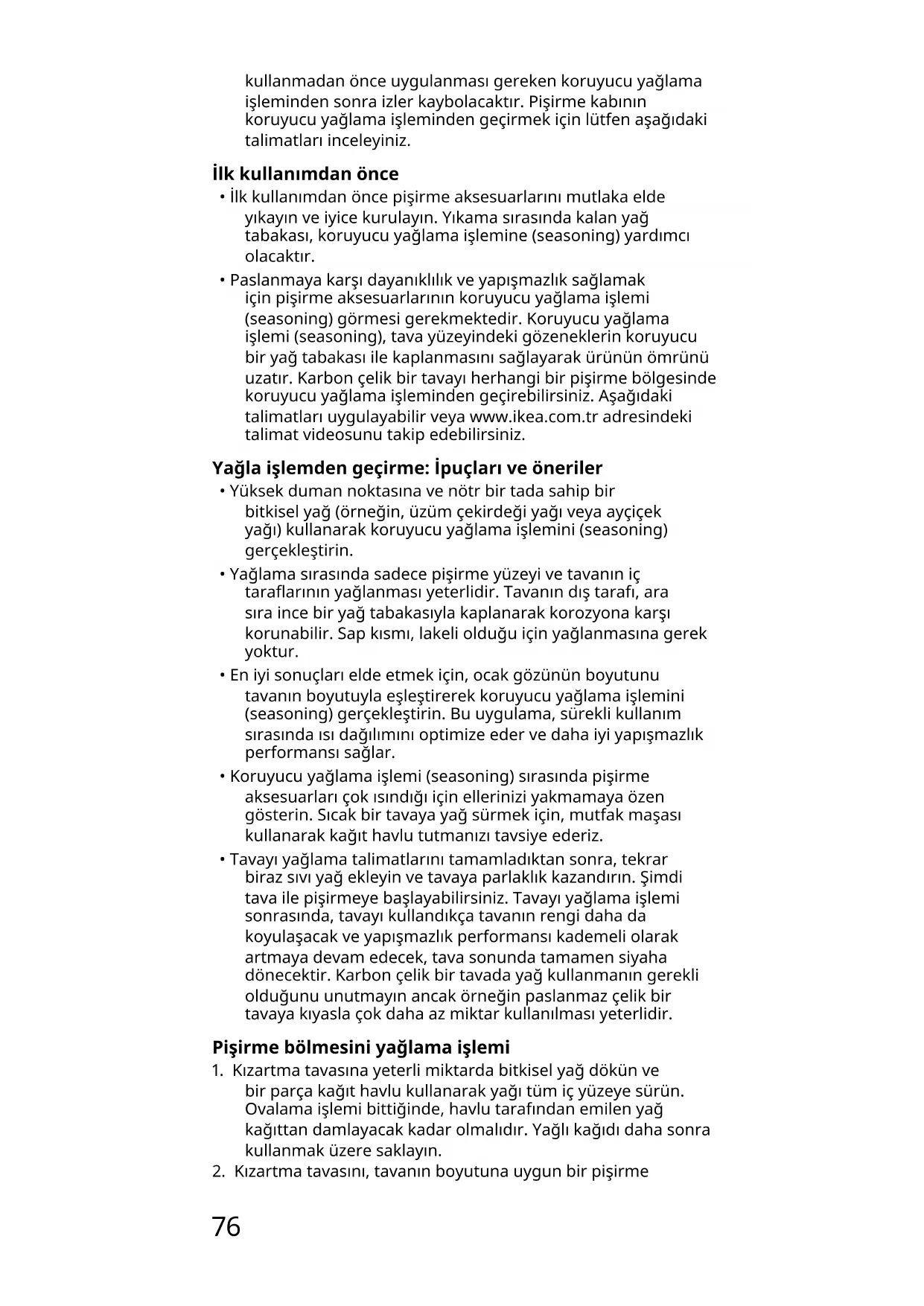 - Paslanmaya karşı dayanıklılık ve yapışmazlık sağlamak için pişirme aksesuarlarının koruyucu yağlama işlemi (seasoning) görmesi gerekmektedir. Koruyucu yağlama işlemi (seasoning), tava yüzeyindeki gözeneklerin koruyucu bir yağ tabakası ile kaplanmasını sağlayarak ürünün ömrünü uzatır. Karbon çelik bir tavayı herhangi bir pişirme bölgesinde koruyucu yağlama işleminden geçirebilirsiniz. Aşağıdaki talimatları uygulayabilir veya www.ikea.com.tr adresindeki talimat videosunu takip edebilirsiniz. Yağlaişlemdengeçirme:İpuçlarıveöneriler