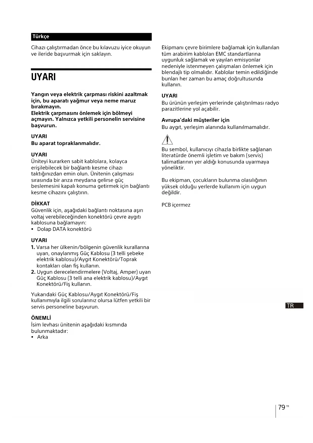 Güç Kablosu (3 telli ana elektrik kablosu)/Aygıt Konektörü/Fiş kullanın. Yukarıdaki Güç Kablosu/Aygıt Konektörü/Fiş kullanımıyla ilgili sorularınız olursa lütfen yetkili bir servis personeline başvurun. ÖNEMLİ İsim levhası ünitenin aşağıdaki kısmında bulunmaktadır: Arka Ekipmanı çevre birimlere bağlamak için kullanılan tüm arabirim kabloları EMC standartlarına uygunluk sağlamak ve yayılan emisyonlar nedeniyle istenmeyen çalışmaları önlemek için blendajlı tip olmalıdır. Kablolar temin edildiğinde bunları her zaman bu amaç doğrultusunda kullanın. UYARI Bu ürünün yerleşim yerlerinde çalıştırılması radyo parazitlerine yol açabilir. Avrupa'daki müşteriler için Bu aygıt, yerleşim alanında kullanılmamalıdır. Bu sembol, kullanıcıyı cihazla birlikte sağlanan literatürde önemli işletim ve bakım (servis) talimatlarının yer aldığı konusunda uyarmaya yöneliktir. Bu ekipman, çocukların bulunma olasılığının yüksek olduğu yerlerde kullanım için uygun değildir. PCB içermez TürkçeTR