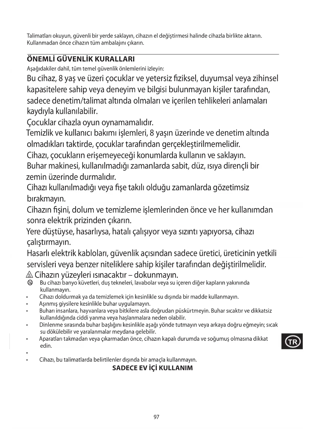 Aşağıdakiler dahil, tüm temel güvenlik önlemlerini izleyin: Bu cihaz, 8 yaş ve üzeri çocuklar ve yetersiz ziksel, duyumsal veya zihinsel kapasitelere sahip veya deneyim ve bilgisi bulunmayan kişiler tarafından, sadece denetim/talimat altında olmaları ve içerilen tehlikeleri anlamaları kaydıyla kullanılabilir. Çocuklar cihazla oyun oynamamalıdır. Temizlik ve kullanıcı bakımı işlemleri, 8 yaşın üzerinde ve denetim altında olmadıkları taktirde, çocuklar tarafından gerçekleştirilmemelidir. Cihazı, çocukların erişemeyeceği konumlarda kullanın ve saklayın. Buhar makinesi, kullanılmadığı zamanlarda sabit, düz, ısıya dirençli bir zemin üzerinde durmalıdır. Cihazı kullanılmadığı veya şe takılı olduğu zamanlarda gözetimsiz bırakmayın. Cihazın şini, dolum ve temizleme işlemlerinden önce ve her kullanımdan sonra elektrik prizinden çıkarın. Yere düştüyse, hasarlıysa, hatalı çalışıyor veya sızıntı yapıyorsa, cihazı çalıştırmayın. Hasarlı elektrik kabloları, güvenlik açısından sadece üretici, üreticinin yetkili servisleri veya benzer niteliklere sahip kişiler tarafından değiştirilmelidir. h Cihazın yüzeyleri ısınacaktır – dokunmayın. b Bu cihazı banyo küvetleri, duş tekneleri, lavabolar veya su içeren diğer kapların yakınında kullanmayın.
