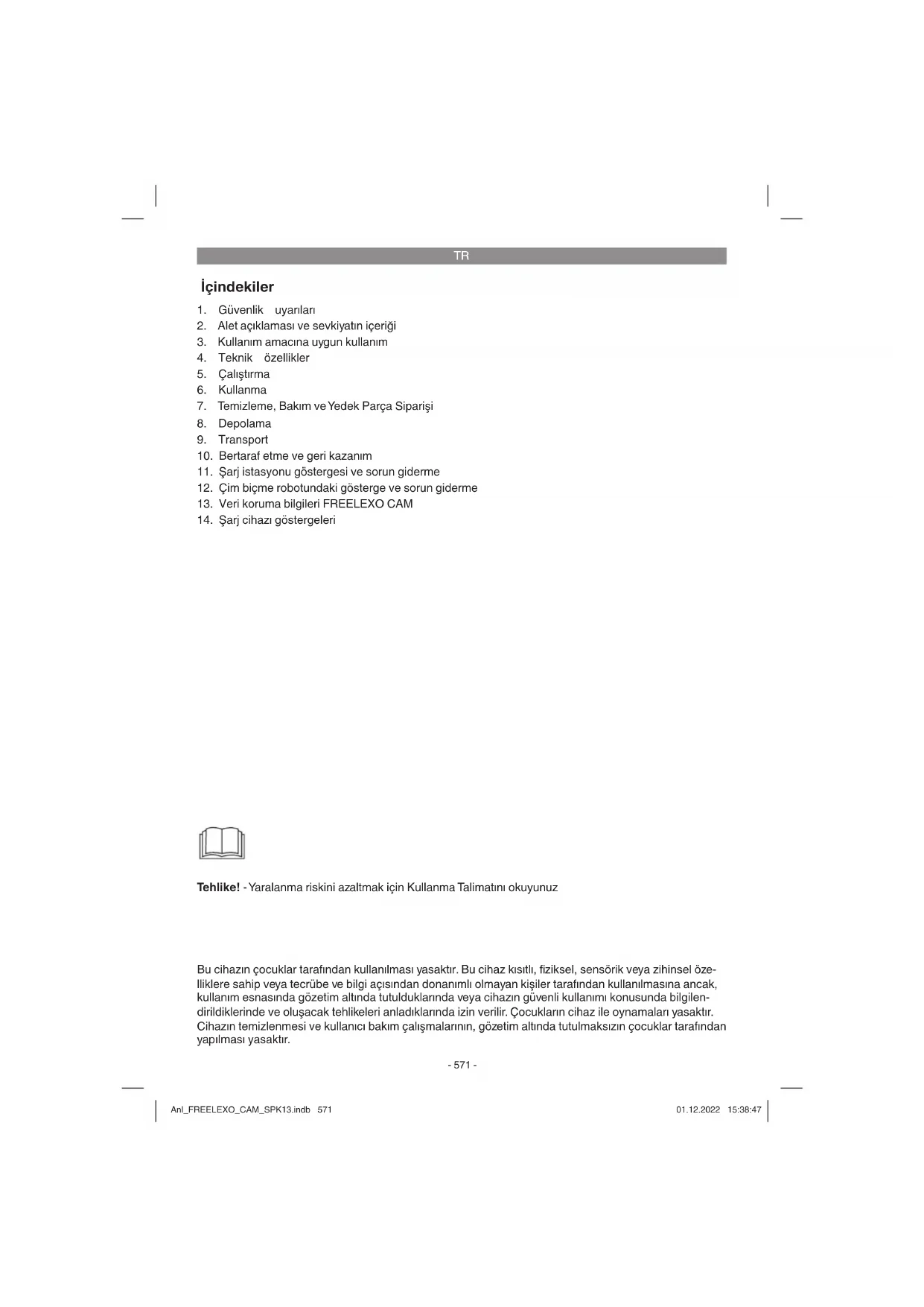 Bu cihazın çocuklar tarafından kullanılması yasaktır. Bu cihaz kısıtlı, fi ziksel, sensörik veya zihinsel öze- lliklere sahip veya tecrübe ve bilgi açısından donanımlı olmayan kişiler tarafından kullanılmasına ancak, kullanım esnasında gözetim altında tutulduklarında veya cihazın güvenli kullanımı konusunda bilgilen- dirildiklerinde ve oluşacak tehlikeleri anladıklarında izin verilir. Çocukların cihaz ile oynamaları yasaktır. Cihazın temizlenmesi ve kullanıcı bakım çalışmalarının, gözetim altında tutulmaksızın çocuklar tarafından yapılması yasaktır. Tehlike! - Yaralanma riskini azaltmak için Kullanma Talimatını okuyunuz Anl_FREELEXO_CAM_SPK13.indb 571Anl_FREELEXO_CAM_SPK13.indb 571 01.12.2022 15:38:4701.12.2022 15:38:47TR