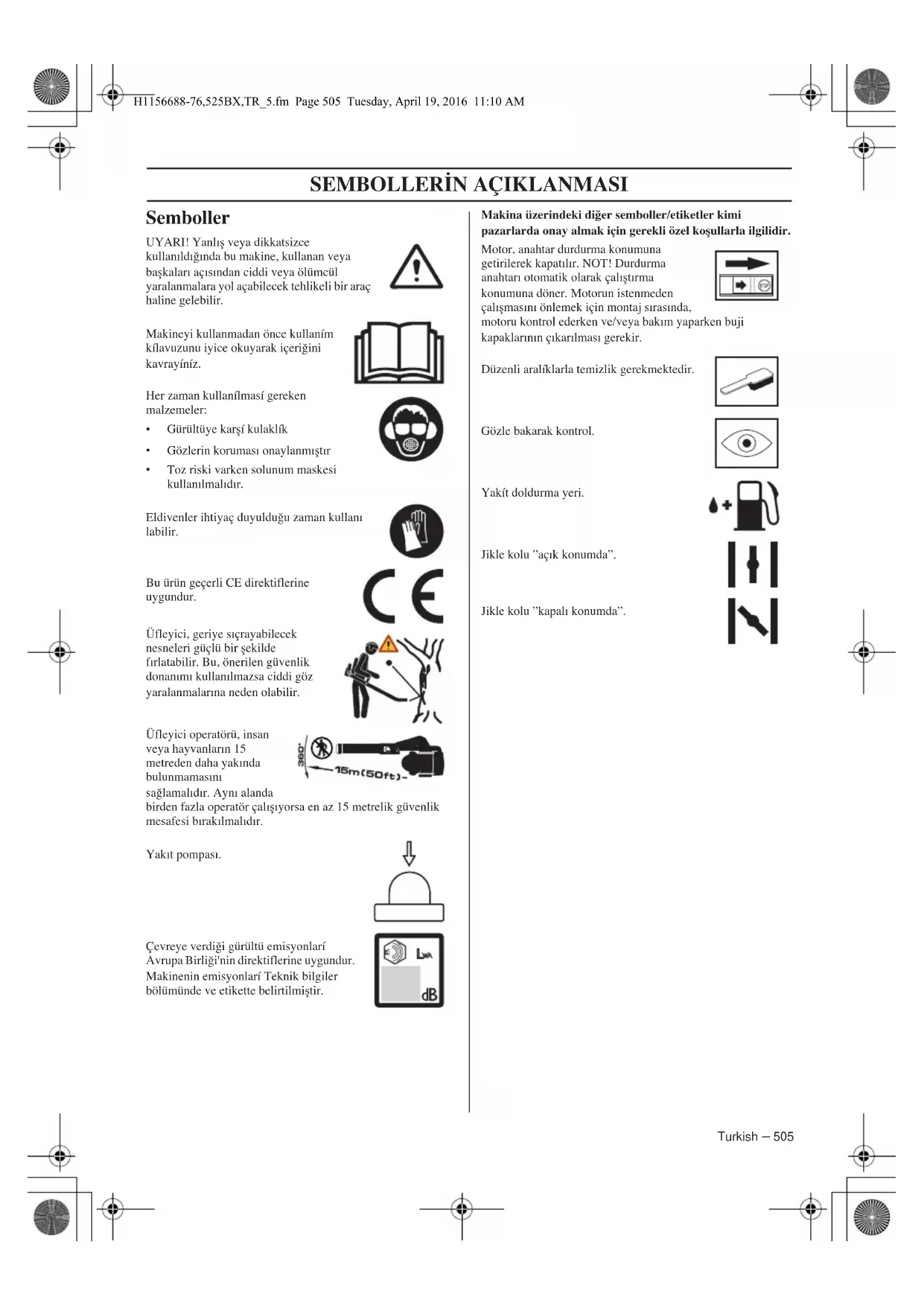 Makina üzerindeki di¤er semboller/etiketler kimi pazarlarda onay almak için gerekli özel koflullarla ilgilidir. Motor, anahtar durdurma konumuna getirilerek kapatılır. NOT! Durdurma anahtarı otomatik olarak çalıfltırma konumuna döner. Motorun istenmeden çalıflmasını önlemek için montaj sırasında, motoru kontrol ederken ve/veya bakım yaparken buji kapaklarının çıkarılması gerekir. Düzenli aralíklarla temizlik gerekmektedir. Gözle bakarak kontrol. Yakít doldurma yeri. Jikle kolu ”açık konumda”. Jikle kolu ”kapalı konumda”. H1156688-76,525BX,TR_5.fm Page 505 Tuesday, April 19, 2016 11:10 AM‹Ç‹NDEK‹LER 506 – Turkish ‹çindekiler Bafllamadan önce afla¤ídaki konulara dikkat ediniz: Kullaním kílavuzunu dikkatle okuyunuz. Husqvarna AB ürünlerini sürekli olarak gelifltirmeye çalíflmaktadír, bu yüzden ürünlerin biçim ve görünüflleri konusunda önceden haber vermeksizin de¤ifliklik yapma hakkímíz saklídír. Üfleyici yalnızca çimenlik alanları, bahçe yollarını, asfalt yolları ve benzeri yerleri temizlemek için tasarlanmıfltır.