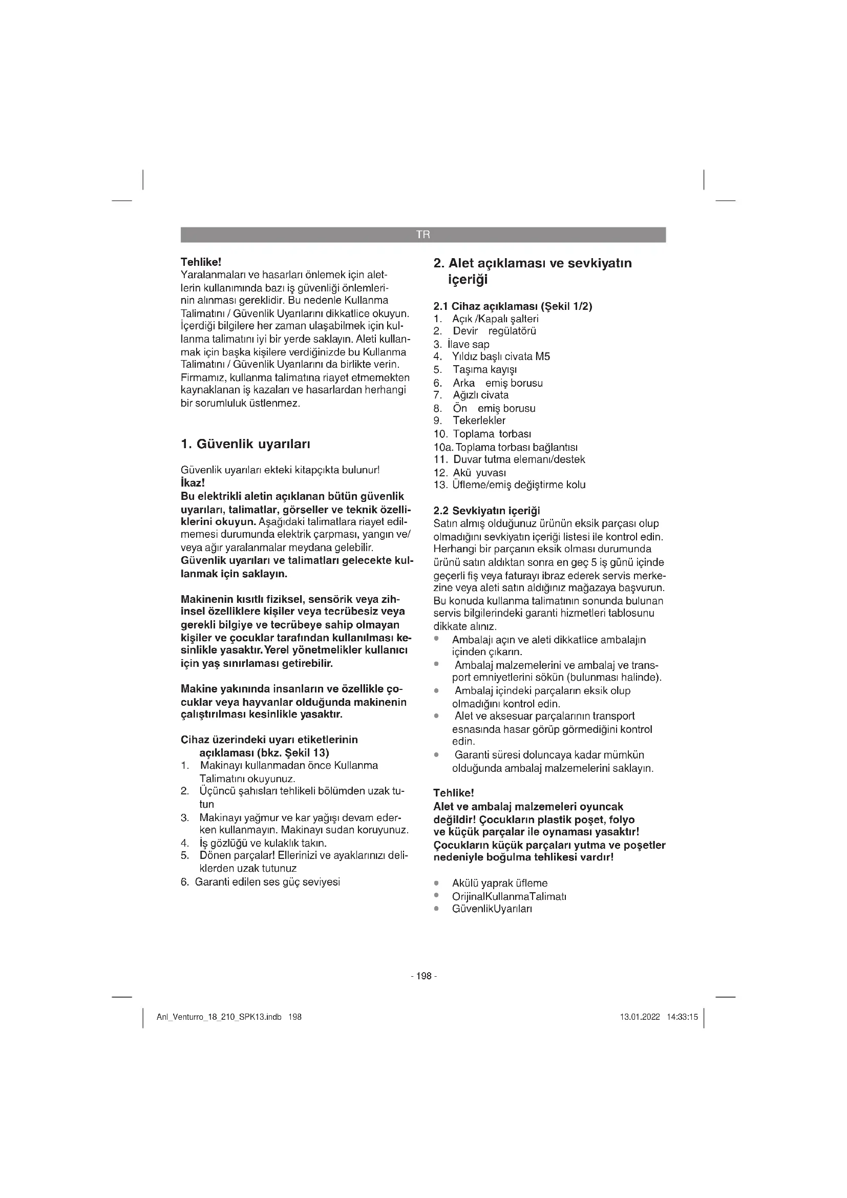 Yaprak vs. gibi toplanacak malzeme nede- niyle oluşan kirlenme nedeniyle değiştirme (üfleme/emiş) kolunun hareket ettirilmesi zorlaşabilir. Bu durumda değiştirme kolunun kolay hareket etmesini sağlamak için kolu birkaç kez emiş ve üfleme yönüne hareket ettirin. Anl_Venturro_18_210_SPK13.indb 202Anl_Venturro_18_210_SPK13.indb 202 13.01.2022 14:33:1513.01.2022 14:33:15TR