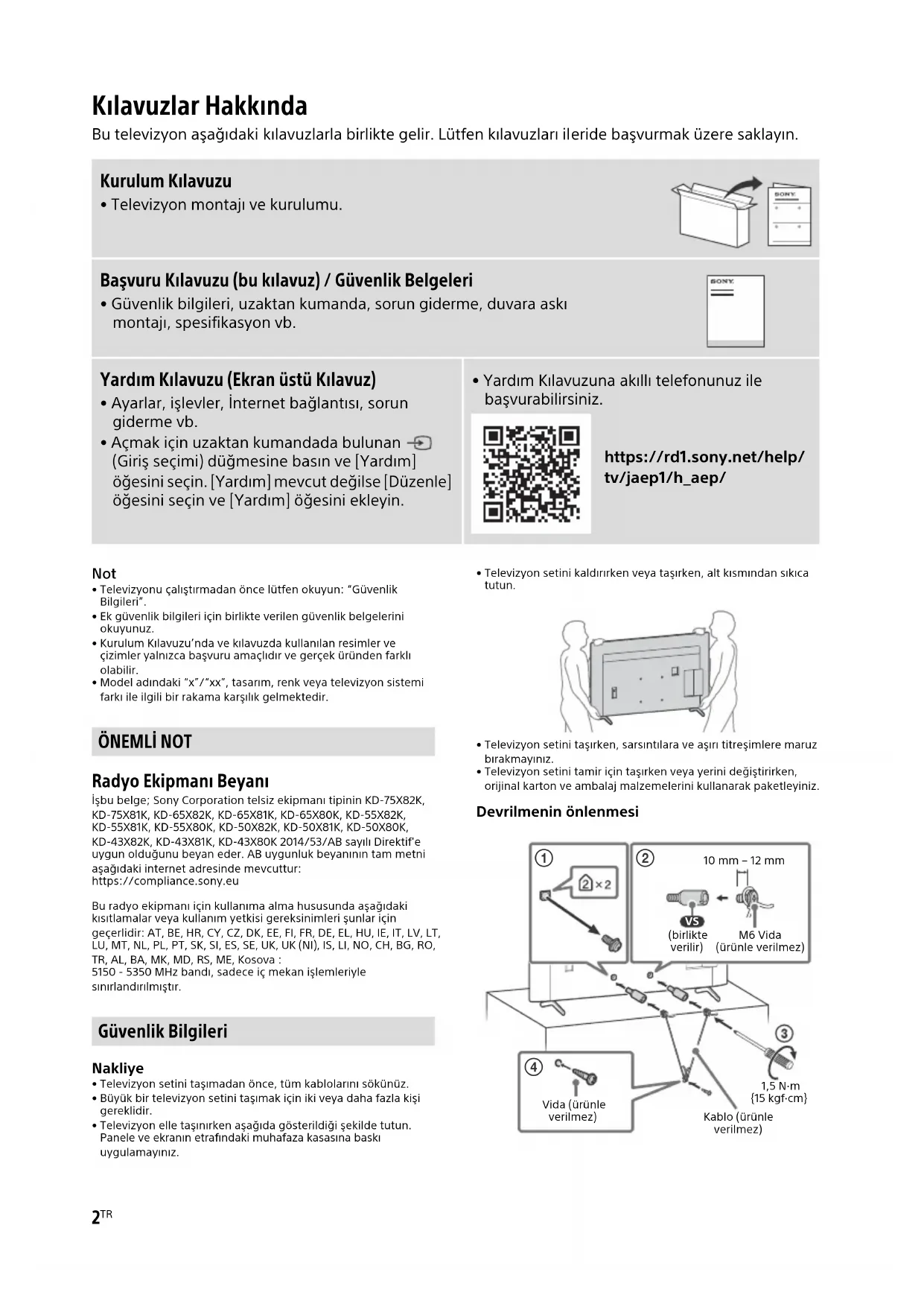 - Televizyonu çalıştırmadan önce lütfen okuyun: “Güvenlik Bilgileri”.• Ek güvenlik bilgileri için birlikte verilen güvenlik belgelerini okuyunuz. • Kurulum Kılavuzu’nda ve kılavuzda kullanılan resimler ve çizimler yalnızca başvuru amaçlıdır ve gerçek üründen farklı olabilir.• Model adındaki “x”/“xx”, tasarım, renk veya televizyon sistemi farkı ile ilgili bir rakama karşılık gelmektedir. Radyo Ekipmanı Beyanı İşbu belge; Sony Corporation telsiz ekipmanı tipinin KD-75X82K, KD-75X81K, KD-65X82K, KD-65X81K, KD-65X80K, KD-55X82K, KD-55X81K, KD-55X80K, KD-50X82K, KD-50X81K, KD-50X80K, KD-43X82K, KD-43X81K, KD-43X80K 2014/53/AB sayılı Direktif'e uygun olduğunu beyan eder. AB uygunluk beyanının tam metni aşağıdaki internet adresinde mevcuttur: https://compliance.sony.euBu radyo ekipmanı için kullanıma alma hususunda aşağıdaki kısıtlamalar veya kullanım yetkisi gereksinimleri şunlar için geçerlidir: AT, BE, HR, CY, CZ, DK, EE, FI, FR, DE, EL, HU, IE, IT, LV, LT, LU, MT, NL, PL, PT, SK, SI, ES, SE, UK, UK (NI), IS, LI, NO, CH, BG, RO, TR, AL, BA, MK, MD, RS, ME, Kosova :5150 - 5350 MHz bandı, sadece iç mekan işlemleriyle sınırlandırılmıştır. Nakliye