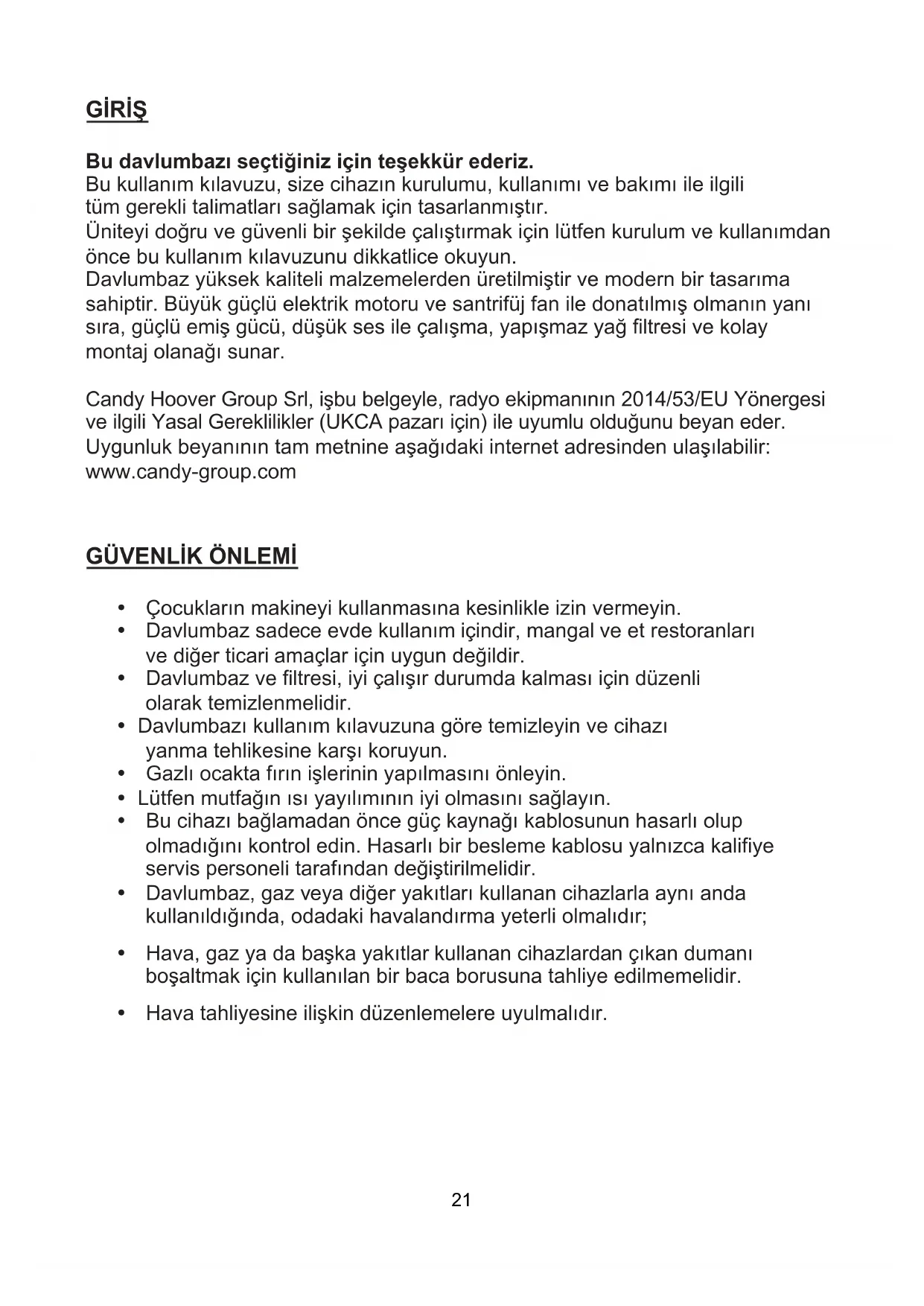 ÇEVREYİ KORUMA 3821 GİRİŞ Bu davlumbazı seçtiğiniz için teşekkür ederiz. Bu kullanım kılavuzu, size cihazın kurulumu, kullanımı ve bakımı ile ilgili tüm gerekli talimatları sağlamak için tasarlanmıştır. Üniteyi doğru ve güvenli bir şekilde çalıştırmak için lütfen kurulum ve kullanımdan önce bu kullanım kılavuzunu dikkatlice okuyun. Davlumbaz yüksek kaliteli malzemelerden üretilmiştir ve modern bir tasarıma sahiptir. Büyük güçlü elektrik motoru ve santrifüj fan ile donatılmış olmanın yanı sıra, güçlü emiş gücü, düşük ses ile çalışma, yapışmaz yağ filtresi ve kolay montaj olanağı sunar. Candy Hoover Group Srl, işbu belgeyle, radyo ekipmanının 2014/53/EU Yönergesi ve ilgili Yasal Gereklilikler (UKCA pazarı için) ile uyumlu olduğunu beyan eder. Uygunluk beyanının tam metnine aşağıdaki internet adresinden ulaşılabilir: www.candy-group.com