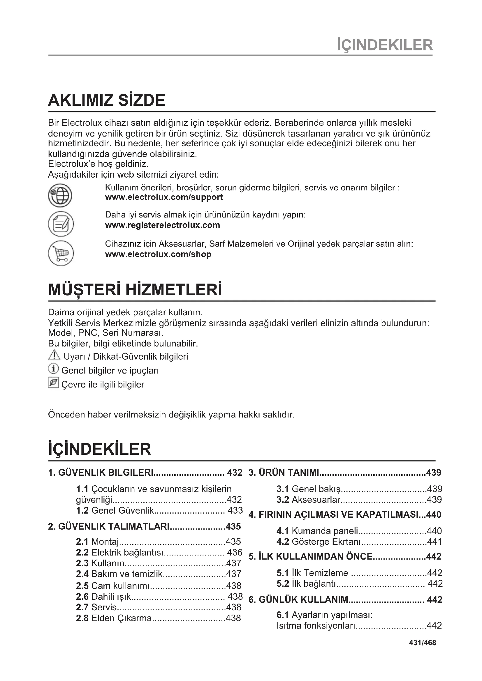 Bir Electrolux cihazı satın aldığınız için teşekkür ederiz. Beraberinde onlarca yıllık mesleki deneyim ve yenilik getiren bir ürün seçtiniz. Sizi düşünerek tasarlanan yaratıcı ve şık ürününüz hizmetinizdedir. Bu nedenle, her seferinde çok iyi sonuçlar elde edeceğinizi bilerek onu her kullandığınızda güvende olabilirsiniz. Electrolux’e hoş geldiniz. Aşağıdakiler için web sitemizi ziyaret edin: Kullanım önerileri, broşürler, sorun giderme bilgileri, servis ve onarım bilgileri: www.electrolux.com/support Daha iyi servis almak için ürününüzün kaydını yapın: www.registerelectrolux.com Cihazınız için Aksesuarlar, Sarf Malzemeleri ve Orijinal yedek parçalar satın alın: www.electrolux.com/shop