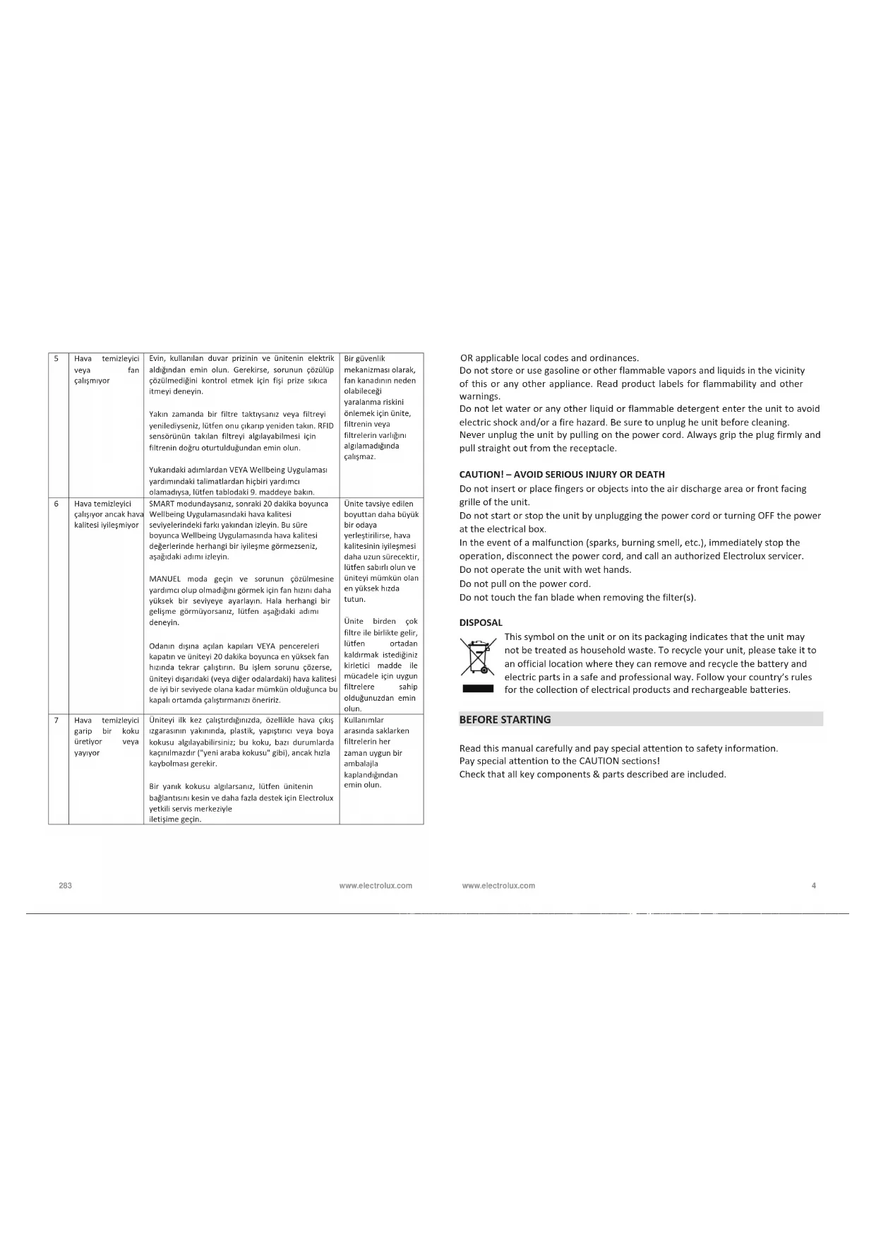 Electrolux WELL A7 / A5 serisi hava temizleyiciyi seçtiğiniz için teşekkür ederiz. Ünitenizden en iyi sonuçları elde etmek için her zaman orijinal Electrolux sarf malzemeleri, aksesuarları ve yedek parçalarını kullanın. Bu cihaz çevre göz önünde bulundurularak tasarlanmıştır ve bu nedenle tüm plastik parçalar geri dönüşüm amacıyla damgalanmıştır. GENEL GÜVENLİK BİLGİLERİ