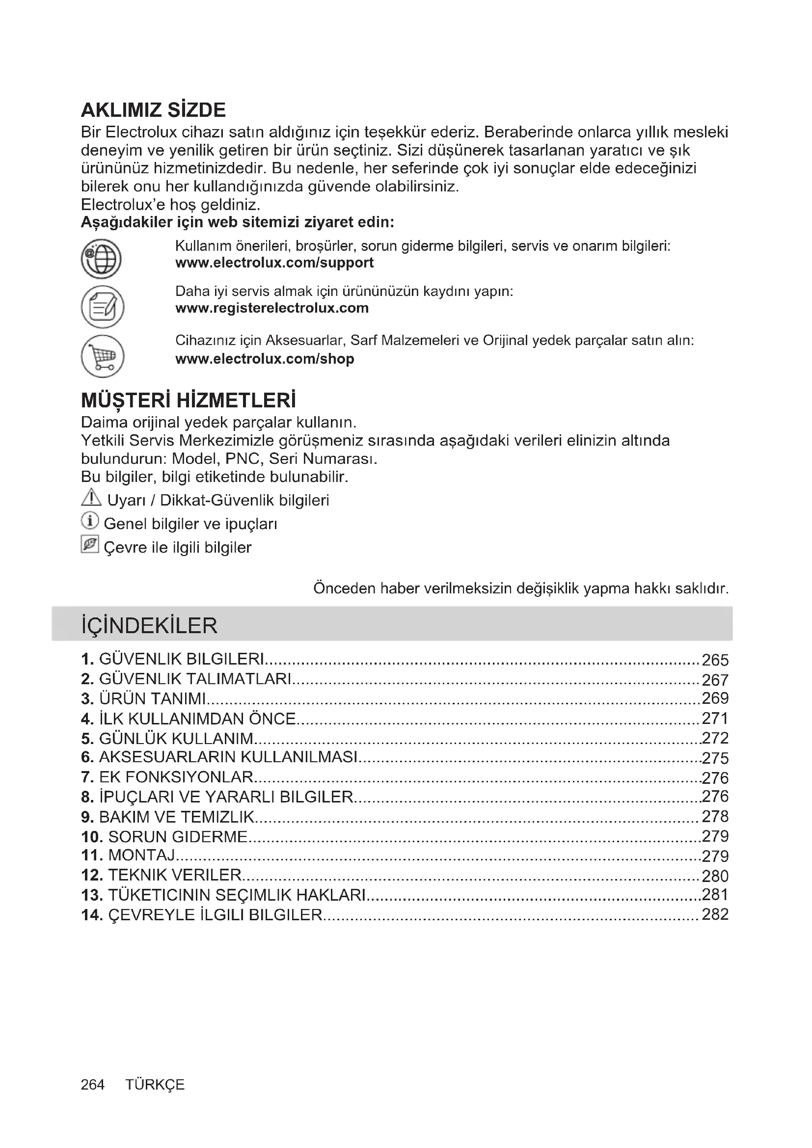 Bir Electrolux cihazı satın aldığınız için teşekkür ederiz. Beraberinde onlarca yıllık mesleki deneyim ve yenilik getiren bir ürün seçtiniz. Sizi düşünerek tasarlanan yaratıcı ve şık ürününüz hizmetinizdedir. Bu nedenle, her seferinde çok iyi sonuçlar elde edeceğinizi bilerek onu her kullandığınızda güvende olabilirsiniz. Electrolux’e hoş geldiniz. Aşağıdakiler için web sitemizi ziyaret edin: Kullanım önerileri, broşürler, sorun giderme bilgileri, servis ve onarım bilgileri: www.electrolux.com/support Daha iyi servis almak için ürününüzün kaydını yapın: www.registerelectrolux.com Cihazınız için Aksesuarlar, Sarf Malzemeleri ve Orijinal yedek parçalar satın alın: www.electrolux.com/shop