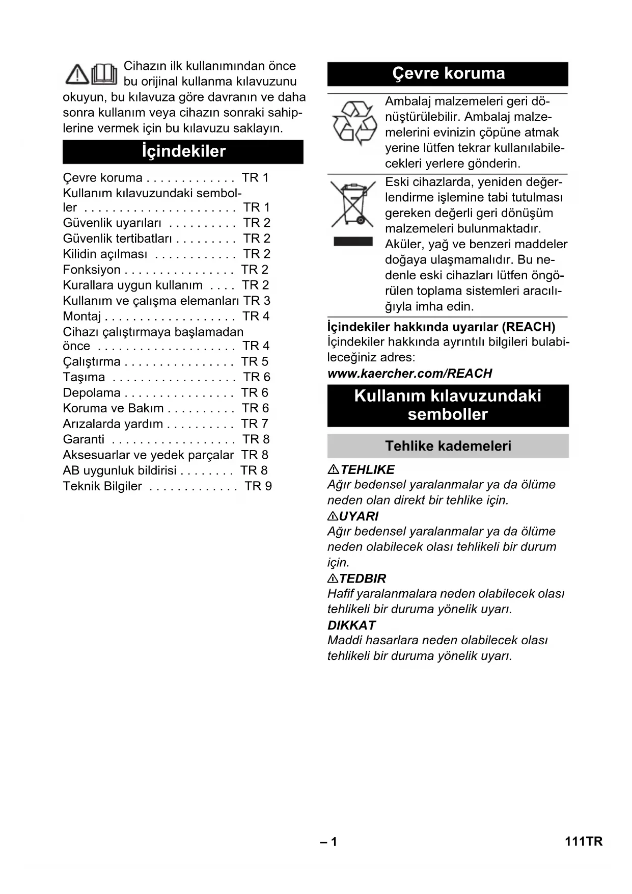 Εκπομπές θορύβου Στάθμη ηχητικής πίεσης (EN 60704-1) dB (A) 56 61,3 Κραδασμοί συσκευής Συνολική τιμή κραδασμών (ISO 5349) m/s² 0,35 0,78 110 EL– 1 Cihazın ilk kullanımından önce bu orijinal kullanma kılavuzunu okuyun, bu kılavuza göre davranın ve daha sonra kullanım veya cihazın sonraki sahip- lerine vermek için bu kılavuzu saklayın. İçindekiler hakkında uyarılar (REACH) İçindekiler hakkında ayrıntılı bilgileri bulabi- leceğiniz adres: www.kaercher.com/REACH TEHLIKE Ağır bedensel yaralanmalar ya da ölüme neden olan direkt bir tehlike için. 몇 UYARI Ağır bedensel yaralanmalar ya da ölüme neden olabilecek olası tehlikeli bir durum için. 몇 TEDBIR Hafif yaralanmalara neden olabilecek olası tehlikeli bir duruma yönelik uyarı. DIKKAT Maddi hasarlara neden olabilecek olası tehlikeli bir duruma yönelik uyarı. İçindekiler Çevre koruma . . . . . . . . . . . . . TR 1 Kullanım kılavuzundaki sembol- ler . . . . . . . . . . . . . . . . . . . . . . TR 1 Güvenlik uyarıları . . . . . . . . . . TR 2 Güvenlik tertibatları . . . . . . . . . TR 2 Kilidin açılması . . . . . . . . . . . . TR 2 Fonksiyon . . . . . . . . . . . . . . . . TR 2 Kurallara uygun kullanım . . . . TR 2 Kullanım ve çalışma elemanları TR 3 Montaj . . . . . . . . . . . . . . . . . . . TR 4 Cihazı çalıştırmaya başlamadan önce . . . . . . . . . . . . . . . . . . . . TR 4 Çalıştırma . . . . . . . . . . . . . . . . TR 5 Taşıma . . . . . . . . . . . . . . . . . . TR 6 Depolama . . . . . . . . . . . . . . . . TR 6 Koruma ve Bakım . . . . . . . . . . TR 6 Arızalarda yardım . . . . . . . . . . TR 7 Garanti . . . . . . . . . . . . . . . . . . TR 8 Aksesuarlar ve yedek parçalar TR 8 AB uygunluk bildirisi . . . . . . . . TR 8 Teknik Bilgiler . . . . . . . . . . . . . TR 9 Çevre koruma Ambalaj malzemeleri geri dö- nüştürülebilir. Ambalaj malze- melerini evinizin çöpüne atmak yerine lütfen tekrar kullanılabile- cekleri yerlere gönderin. Eski cihazlarda, yeniden değer- lendirme işlemine tabi tutulması gereken değerli geri dönüşüm malzemeleri bulunmaktadır. Aküler, yağ ve benzeri maddeler doğaya ulaşmamalıdır. Bu ne- denle eski cihazları lütfen öngö- rülen toplama sistemleri aracılı- ğıyla imha edin. Kullanım kılavuzundaki semboller Tehlike kademeleri 111TR– 2 Cihazı kullanmaya başlamadan önce, bu kullanım kılavuzu ve ekteki 5.956-659 nu- maralı Tek diskli makinelerin güvenlik uya- rıları broşürünü okuyun ve buna uygun şe- kilde davranın. Güvenlik düzenekleri kullanıcının korunma- sını sağladığından, devre dışı bırakılma- malıdır ve düzgün çalıştıklarından emin olunmalıdır. Cihazın farkında olmadan çalıştırılmasını önler. Cihaz, düz zeminlerin parlatılması için kul- lanılır. Parlatma sırasında ortaya çıkan toz, değiş- tirilebilir bir filtre torbası tarafından toplanır. – 500 mm'lik çalışma yüksekliği etkin bir kullanıma olanak sağlar. – Elektrikle çalışma modu, çalışma süresi kısıtlaması olmadan yüksek bir perfor- mans özelliği sağlar. Bu cihazı sadece bu kullanım kılavuzunda- ki bilgilere uygun olarak kullanın. – Cihaz, sadece kaygan zeminlerin parla- tılması için kullanılmalıdır. – Cihaz, sadece orijinal aksesuarı ve ye- dek parçalarıyla donatılabilir. – Cihaz, patlama tehlikesi bulunan ortam- larda kullanım için uygun değildir. – Bu cihaz, sadece kuru uygulama için üretilmiştir ve açık havada sulu koşullar altında kullanılmamalı ve saklanmama- lıdır. Güvenlik uyarıları Güvenlik tertibatları Kilidin açılması Fonksiyon Kurallara uygun kullanım 112 TR– 3 1 Sağ şalter 2 Eğim ayar kolu 3 Elektrik fişiyle birlikte elektrik kablosu 4 Priz (sadece cihaz üreticisi tarafından onaylanan aksesuarlar için) 5 Sol şalter 6 Sol kilit açma 7 "Şebeke gerilimi mevcut" kontrol lam- bası 8 Sağ kilit açma 9 Kol 10 Kablo kancası, döner 11 Kumanda hattının soket bağlantısı 12 Vakum önlüğü Kullanım ve çalışma elemanları