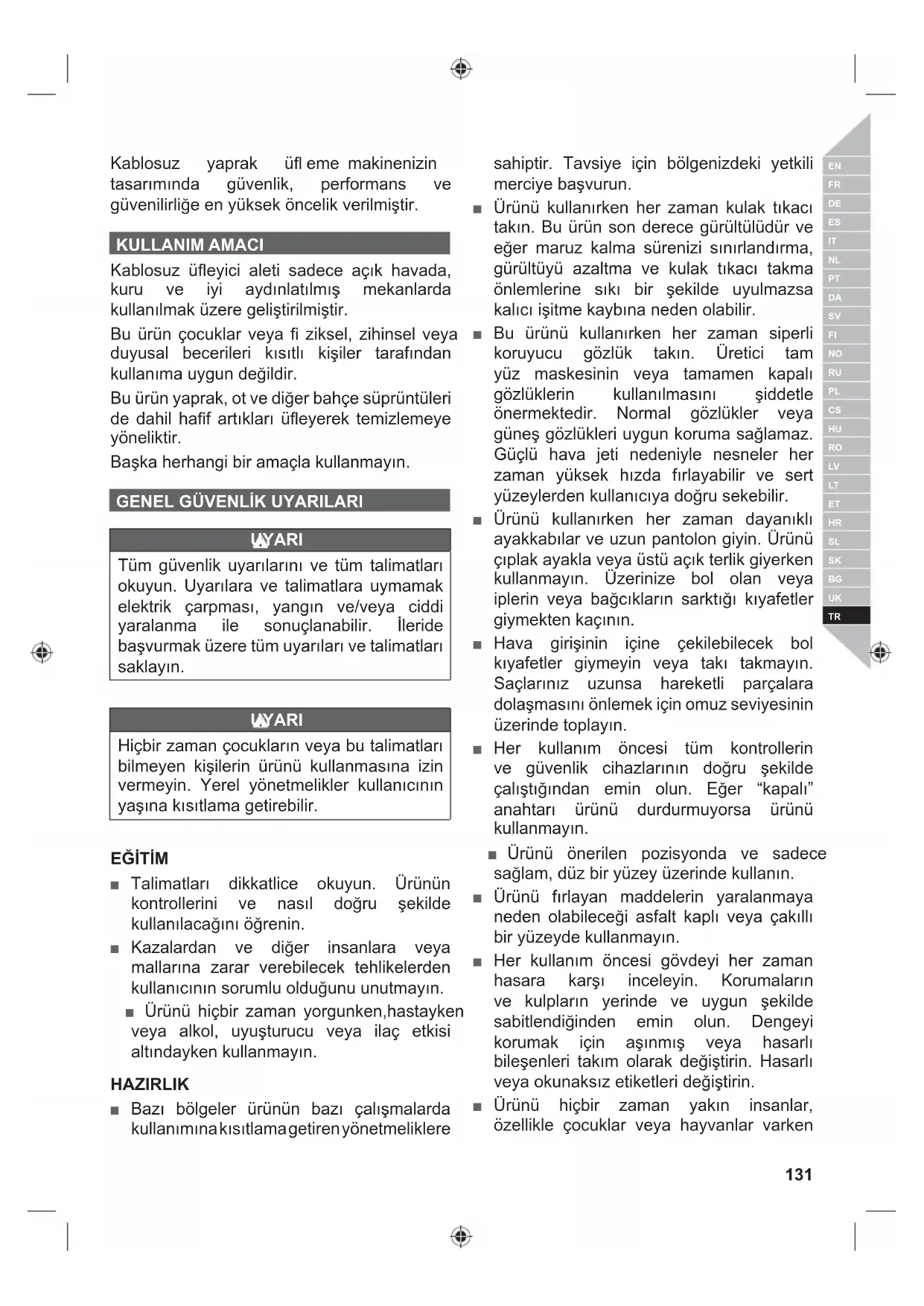 Kablosuz yaprak üfl eme makinenizin tasarımında güvenlik, performans ve güvenilirliğe en yüksek öncelik verilmiştir. KULLANIM AMACI Kablosuz üfl eyici aleti sadece açık havada, kuru ve iyi aydınlatılmış mekanlarda kullanılmak üzere geliştirilmiştir. Bu ürün çocuklar veya fi ziksel, zihinsel veya duyusal becerileri kısıtlı kişiler tarafından kullanıma uygun değildir. Bu ürün yaprak, ot ve diğer bahçe süprüntüleri de dahil hafi f artıkları üfl eyerek temizlemeye yöneliktir. Başka herhangi bir amaçla kullanmayın.