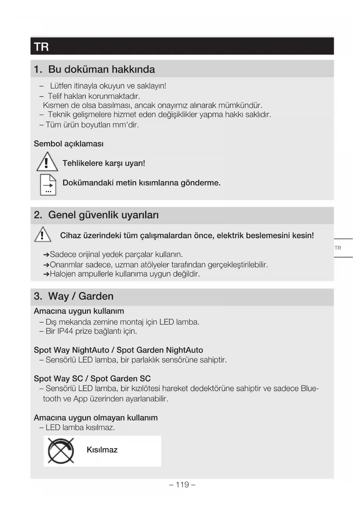 Amacına uygun kullanım – Dış mekanda zemine montaj için LED lamba. – Bir IP44 prize bağlantı için. Spot Way NightAuto/Spot Garden NightAuto – Sensörlü LED lamba, bir parlaklık sensörüne sahiptir. Spot Way SC/Spot Garden SC – Sensörlü LED lamba, bir kızılötesi hareket dedektörüne sahiptir ve sadece Blue- tooth ve App üzerinden ayarlanabilir. Amacına uygun olmayan kullanım – LED lamba kısılmaz. Kısılmaz TR– 120 – Spot Way teslimat kapsamı (Şek. 3.1) – Direk, zemin plakası ve elektrik fişli bağlantı kablosu dahil lamba – Üç vida – Üç dübel Spot Garden teslimat kapsamı (Şek. 3.2) – Elektrik fişli bağlantı kablosu dahil lamba – Çakma çubuğu – Iki vida Spot Way ürün boyutları (Şek. 3.3) Spot Garden ürün boyutları (Şek. 3.4) Ürüne genel bakış (Şek. 3.5 – 3.10) A Lamba gövdesi B Hareket sensörü (sadece Spot Way / Spot Garden SC) C Parlaklık sensörü (sadece Spot Way/Garden NightAuto) D Alacakaranlık ayarı (sadece Spot Way/Garden NightAuto) E Zemin plakası ile direk (sadece Spot Way) F Çakma çubuğu (sadece Spot Garden) G Fişli elektrik bağlantı kablosu Kapsama alanı Spot Way / Spot Garden SC (Şek. 3.11 – 3.16) Işık şiddeti dağılımı (Şek. 3.17)