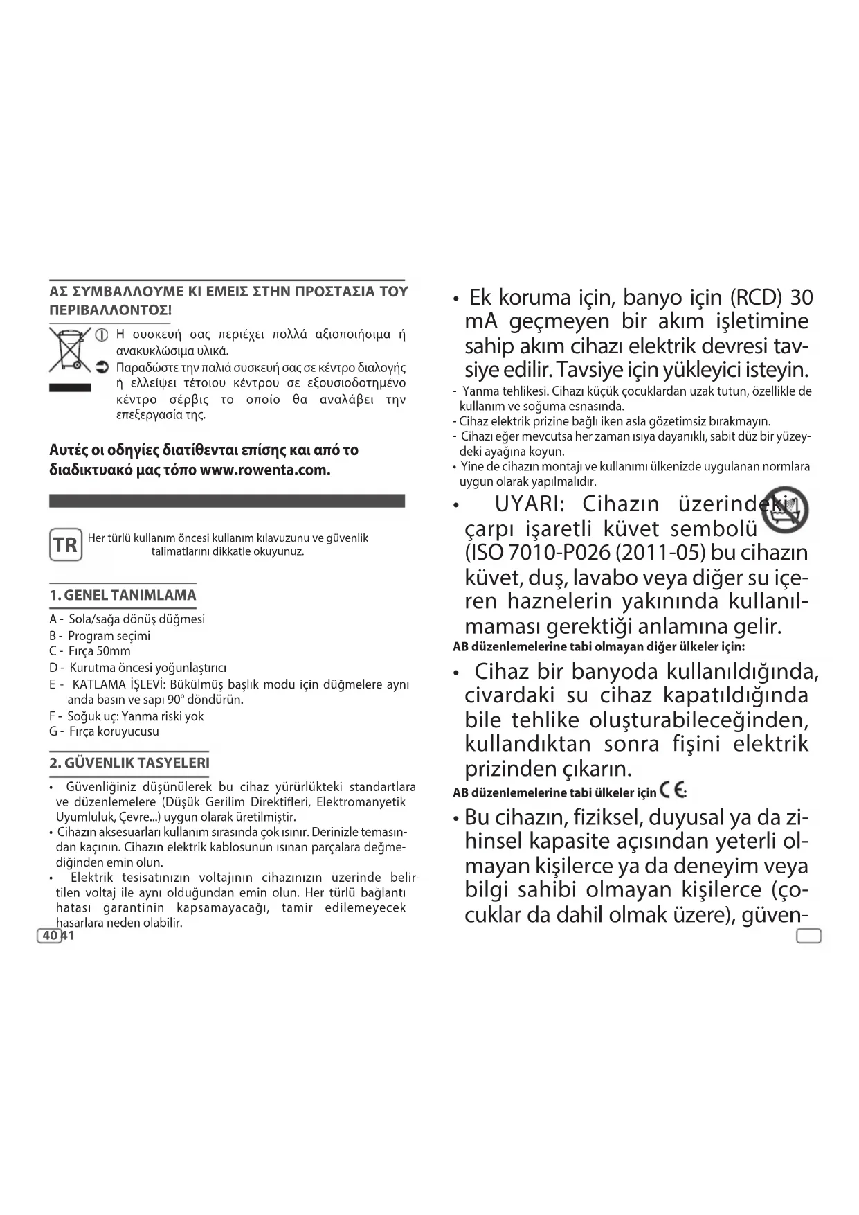 - Cihaz bir banyoda kullanıldığında, civardaki su cihaz kapatıldığında bile tehlike oluşturabileceğinden, kullandıktan sonra fişini elektrik prizinden çıkarın. AB düzenlemelerine tabi ülkeler için :