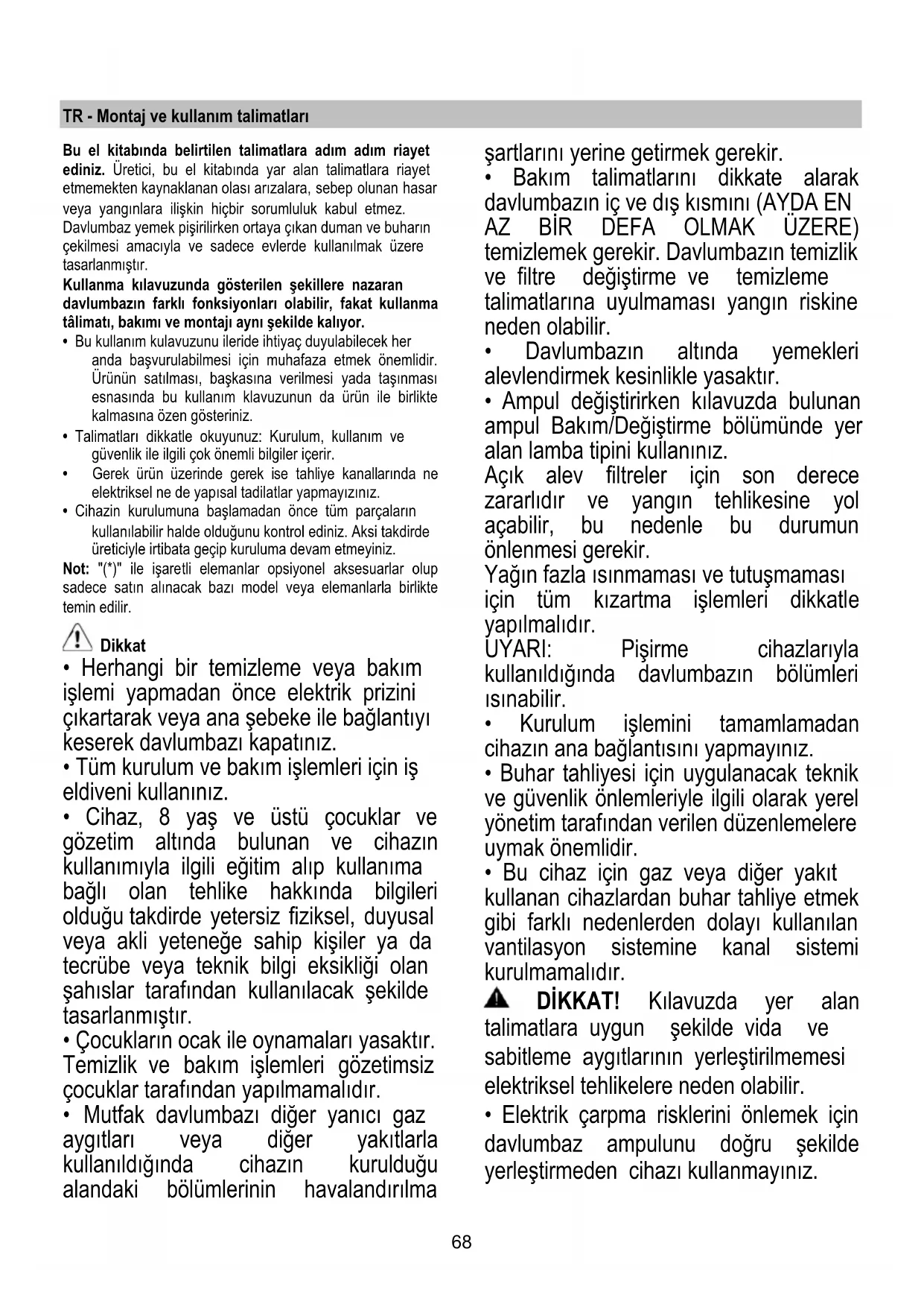 - Bakım talimatlarını dikkate alarak davlumbazın iç ve dış kısmını (AYDA EN AZ BİR DEFA OLMAK ÜZERE) temizlemek gerekir. Davlumbazın temizlik ve filtre değiştirme ve temizleme talimatlarına uyulmaması yangın riskine neden olabilir.