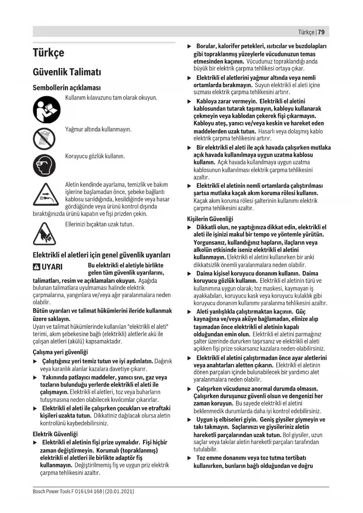 Τα προϊόντα, τα εξαρτήματα και οι συσκευασίες πρέπει να ανακυκλώνονται με τρόπο φιλικό προς το περιβάλλον. Μην ρίχνετε τα προϊόντα στα απορρίμματα του σπιτιού σας! Μόνο για χώρες τηςΕΕ: Σύμφωνα με την Ευρωπαϊκή Οδηγία 2012/19/ΕΕ σχετικά με τις παλιές ηλεκτρικές και ηλεκτρονικές συσκευές και τη μεταφορά της οδηγίας αυτής σε εθνικό δίκαιο οι άχρηστες συσκευές πρέπει να συλλέγονται ξεχωριστά για να ανακυκλωθούν με τρόπο φιλικό προς το περιβάλλον. F 016 L94 168 | (20.01.2021) Bosch Power ToolsTürkçe | 79 Türkçe Güvenlik Talimatı Sembollerin açıklaması Kullanım kılavuzunu tam olarak okuyun. Yağmur altında kullanmayın. Koruyucu gözlük kullanın. Aletin kendinde ayarlama, temizlik ve bakım işlerine başlamadan önce, şebeke bağlantı kablosu sarıldığında, kesildiğinde veya hasar gördüğünde veya ürünü kontrol dışında bıraktığınızda ürünü kapatın ve fişi prizden çekin. Ellerinizi bıçaktan uzak tutun. Elektrikli el aletleri için genel güvenlik uyarıları UYARI Bu elektrikli el aletiyle birlikte gelen tüm güvenlik uyarılarını, talimatları, resim ve açıklamaları okuyun. Aşağıda bulunan talimatlara uyulmaması halinde elektrik çarpmalarına, yangınlara ve/veya ağır yaralanmalara neden olabilir. Bütün uyarıları ve talimat hükümlerini ileride kullanmak üzere saklayın. Uyarı ve talimat hükümlerinde kullanılan "elektrikli el aleti" terimi, akım şebekesine bağlı (elektrikli) aletlerle akü ile çalışan aletleri (akülü) kapsamaktadır. Çalışma yeri güvenliği u Çalıştığınız yeri temiz tutun ve iyi aydınlatın. Dağınık veya karanlık alanlar kazalara davetiye çıkarır. u Yakınında patlayıcı maddeler, yanıcı sıvı, gaz veya tozların bulunduğu yerlerde elektrikli el aleti ile çalışmayın. Elektrikli el aletleri, toz veya buharların tutuşmasına neden olabilecek kıvılcımlar çıkarırlar. u Elektrikli el aleti ile çalışırken çocukları ve etraftaki kişileri uzakta tutun. Dikkatiniz dağılacak olursa aletin kontrolünü kaybedebilirsiniz. Elektrik Güvenliği u Elektrikli el aletinin fişi prize uymalıdır. Fişi hiçbir zaman değiştirmeyin. Korumalı (topraklanmış) elektrikli el aletleri ile birlikte adaptör fiş kullanmayın. Değiştirilmemiş fiş ve uygun priz elektrik çarpma tehlikesini azaltır. u Borular, kalorifer petekleri, ısıtıcılar ve buzdolapları gibi topraklanmış yüzeylerle vücudunuzun temas etmesinden kaçının. Vücudunuz topraklandığı anda büyük bir elektrik çarpma tehlikesi ortaya çıkar. u Elektrikli el aletlerini yağmur altında veya nemli ortamlarda bırakmayın. Suyun elektrikli el aleti içine sızması elektrik çarpma tehlikesini artırır. u Kabloya zarar vermeyin. Elektrikli el aletini kablosundan tutarak taşımayın, kabloyu kullanarak çekmeyin veya kablodan çekerek fişi çıkarmayın. Kabloyu ateş, yanıcı ve/veya keskin ve hareket eden maddelerden uzak tutun. Hasarlı veya dolaşmış kablo elektrik çarpma tehlikesini artırır. u Bir elektrikli el aleti ile açık havada çalışırken mutlaka açık havada kullanılmaya uygun uzatma kablosu kullanın. Açık havada kullanılmaya uygun uzatma kablosunun kullanılması elektrik çarpma tehlikesini azaltır. u Elektrikli el aletinin nemli ortamlarda çalıştırılması şartsa mutlaka kaçak akım koruma rölesi kullanın. Kaçak akım koruma rölesi şalterinin kullanımı elektrik çarpma tehlikesini azaltır. Kişilerin Güvenliği u Dikkatli olun, ne yaptığınıza dikkat edin, elektrikli el aleti ile işinizi makul bir tempo ve yöntemle yürütün. Yorgunsanız, kullandığınız hapların, ilaçların veya alkolün etkisinde iseniz elektrikli el aletini kullanmayın. Elektrikli el aletini kullanırken bir anki dikkatsizlik önemli yaralanmalara neden olabilir. u Daima kişisel koruyucu donanım kullanın. Daima koruyucu gözlük kullanın. Elektrikli el aletinin türü ve kullanımına uygun olarak; toz maskesi, kaymayan iş ayakkabıları, koruyucu kask veya koruyucu kulaklık gibi koruyucu donanım kullanımı yaralanma tehlikesini azaltır. u Aleti yanlışlıkla çalıştırmaktan kaçının. Güç kaynağına ve/veya aküye bağlamadan, elinize alıp taşımadan önce elektrikli el aletinin kapalı olduğundan emin olun. Elektrikli el aletini parmağınız şalter üzerinde dururken taşırsanız ve elektrikli el aleti açıkken fişi prize sokarsanız kazalara neden olabilirsiniz. u Elektrikli el aletini çalıştırmadan önce ayar aletlerini veya anahtarları aletten çıkarın. Elektrikli el aletinin dönen parçaları içinde bulunabilecek bir yardımcı alet yaralanmalara neden olabilir. u Çalışırken vücudunuz anormal durumda olmasın. Çalışırken duruşunuz güvenli olsun ve dengenizi her zaman koruyun. Bu sayede elektrikli el aletini beklenmedik durumlarda daha iyi kontrol edebilirsiniz. u Uygun iş elbiseleri giyin. Geniş giysiler giymeyin ve takı takmayın. Saçlarınızı ve giysileriniz aletin hareketli parçalarından uzak tutun. Bol giysiler, uzun saçlar veya takılar aletin hareketli parçaları tarafından tutulabilir. u Toz emme donanımı veya toz tutma tertibatı kullanırken, bunların bağlı olduğundan ve doğru Bosch Power Tools F 016 L94 168 | (20.01.2021)80 | Türkçe kullanıldığından emin olun. Toz emme donanımının kullanımı tozdan kaynalanabilecek tehlikeleri azaltır. u Aletleri sık kullanmanız sebebiyle onlara alışmış olmanız, güvenlik prensiplerine uymanızı önlememelidir. Dikkatsiz bir hareket, bir anda ciddi yaralanmalara yol açabilir. El