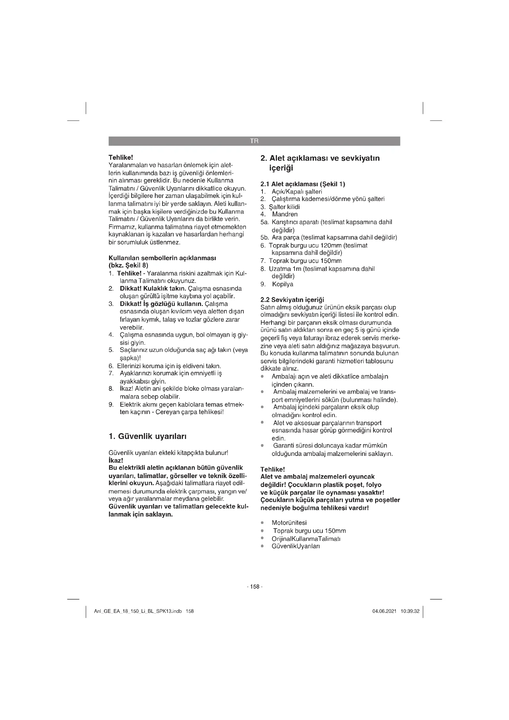 talimatlara göre kullanılmadığında veya bakımı düzgün şekilde yapılmadığında el-kol titreşiminden kaynaklanan sağlık hasarlarının oluşması. Anl_GE_EA_18_150_Li_BL_SPK13.indb 159Anl_GE_EA_18_150_Li_BL_SPK13.indb 159 04.06.2021 10:39:3204.06.2021 10:39:32TR