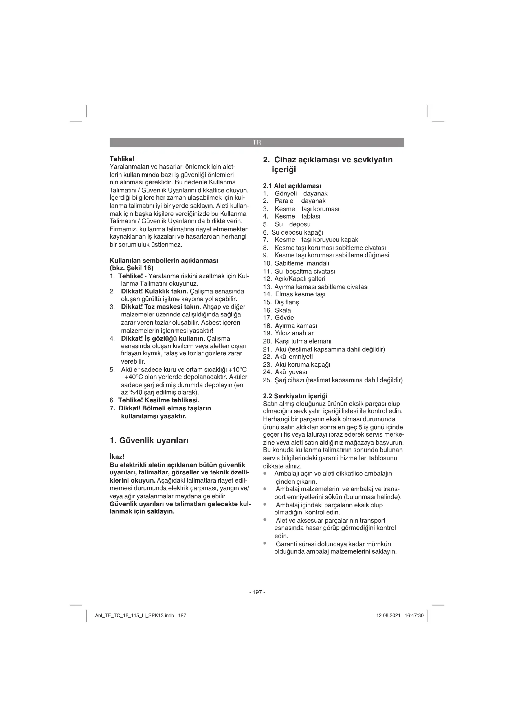 talimatlara göre kullanılmadığında veya bakımı düzgün şekilde yapılmadığında el-kol titreşiminden kaynaklanan sağlık hasarlarının Anl_TE_TC_18_115_Li_SPK13.indb 198Anl_TE_TC_18_115_Li_SPK13.indb 198 12.08.2021 16:47:3012.08.2021 16:47:30TR