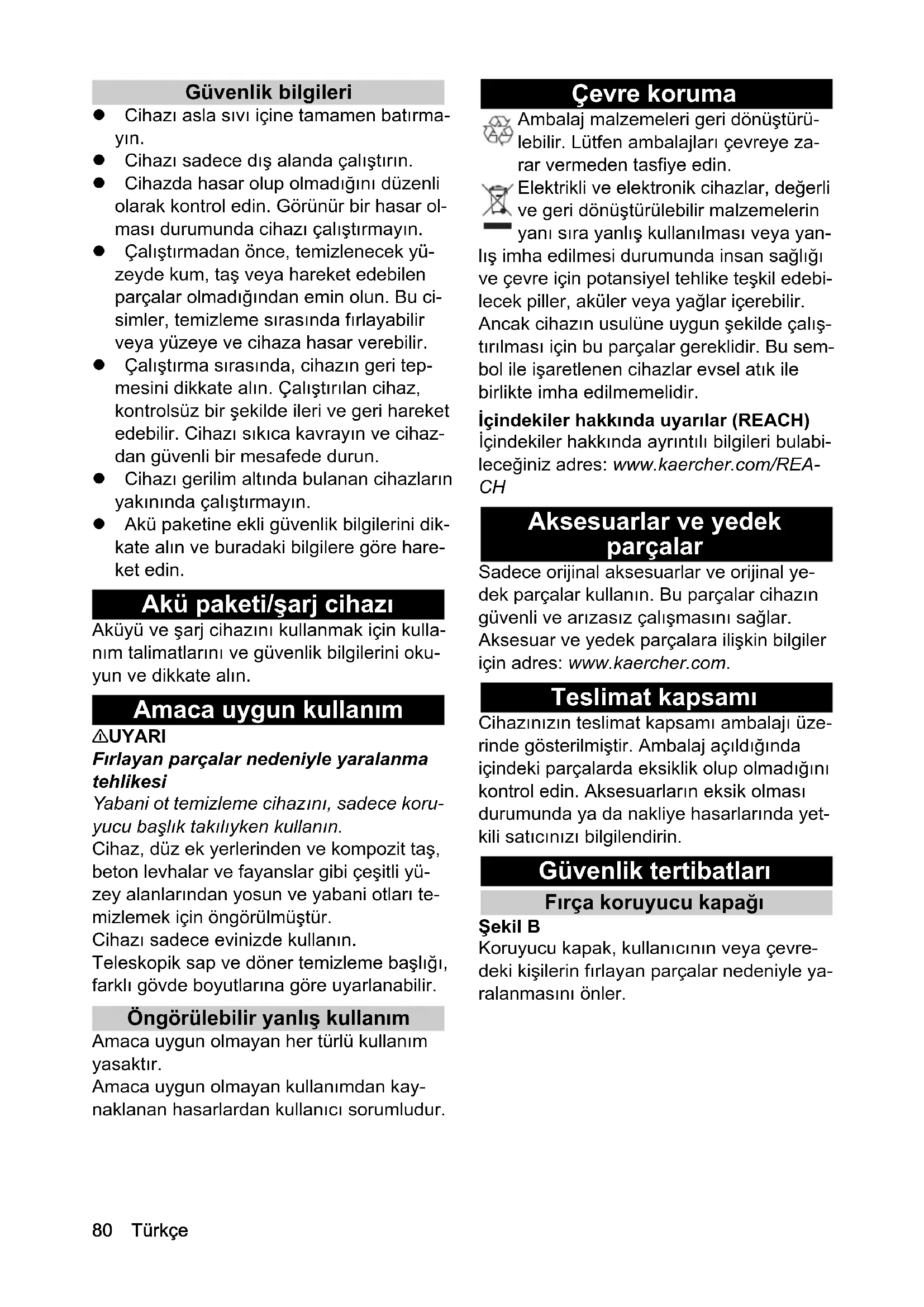 • AB Uygunluk Beyanı Türkçe Güvenlik bilgileri Cihazı asla sıvı içine tamamen batırma- yın. Cihazı sadece dış alanda çalıştırın. Cihazda hasar olup olmadığını düzenli olarak kontrol edin. Görünür bir hasar ol- ması durumunda cihazı çalıştırmayın. Çalıştırmadan önce, temizlenecek yü- zeyde kum, taş veya hareket edebilen parçalar olmadığından emin olun. Bu ci- simler, temizleme sırasında fırlayabilir veya yüzeye ve cihaza hasar verebilir. Çalıştırma sırasında, cihazın geri tep- mesini dikkate alın. Çalıştırılan cihaz, kontrolsüz bir şekilde ileri ve geri hareket edebilir. Cihazı sıkıca kavrayın ve cihaz- dan güvenli bir mesafede durun. Cihazı gerilim altında bulanan cihazların yakınında çalıştırmayın. Akü paketine ekli güvenlik bilgilerini dik- kate alın ve buradaki bilgilere göre hare- ket edin. Akü paketi/şarj cihazı Aküyü ve şarj cihazını kullanmak için kulla- nım talimatlarını ve güvenlik bilgilerini oku- yun ve dikkate alın. Amaca uygun kullanım 몇 UYARI Fırlayan parçalar nedeniyle yaralanma tehlikesi Yabani ot temizleme cihazını, sadece koru- yucu başlık takılıyken kullanın. Cihaz, düz ek yerlerinden ve kompozit taş, beton levhalar ve fayanslar gibi çeşitli yü- zey alanlarından yosun ve yabani otları te- mizlemek için öngörülmüştür. Cihazı sadece evinizde kullanın. Teleskopik sap ve döner temizleme başlığı, farklı gövde boyutlarına göre uyarlanabilir. Öngörülebilir yanlış kullanım Amaca uygun olmayan her türlü kullanım yasaktır. Amaca uygun olmayan kullanımdan kay- naklanan hasarlardan kullanıcı sorumludur. Çevre koruma Ambalaj malzemeleri geri dönüştürü- lebilir. Lütfen ambalajları çevreye za- rar vermeden tasfiye edin. Elektrikli ve elektronik cihazlar, değerli ve geri dönüştürülebilir malzemelerin yanı sıra yanlış kullanılması veya yan- lış imha edilmesi durumunda insan sağlığı ve çevre için potansiyel tehlike teşkil edebi- lecek piller, aküler veya yağlar içerebilir. Ancak cihazın usulüne uygun şekilde çalış- tırılması için bu parçalar gereklidir. Bu sem- bol ile işaretlenen cihazlar evsel atık ile birlikte imha edilmemelidir. İçindekiler hakkında uyarılar (REACH) İçindekiler hakkında ayrıntılı bilgileri bulabi- leceğiniz adres: www.kaercher.com/REA- p. 8580
