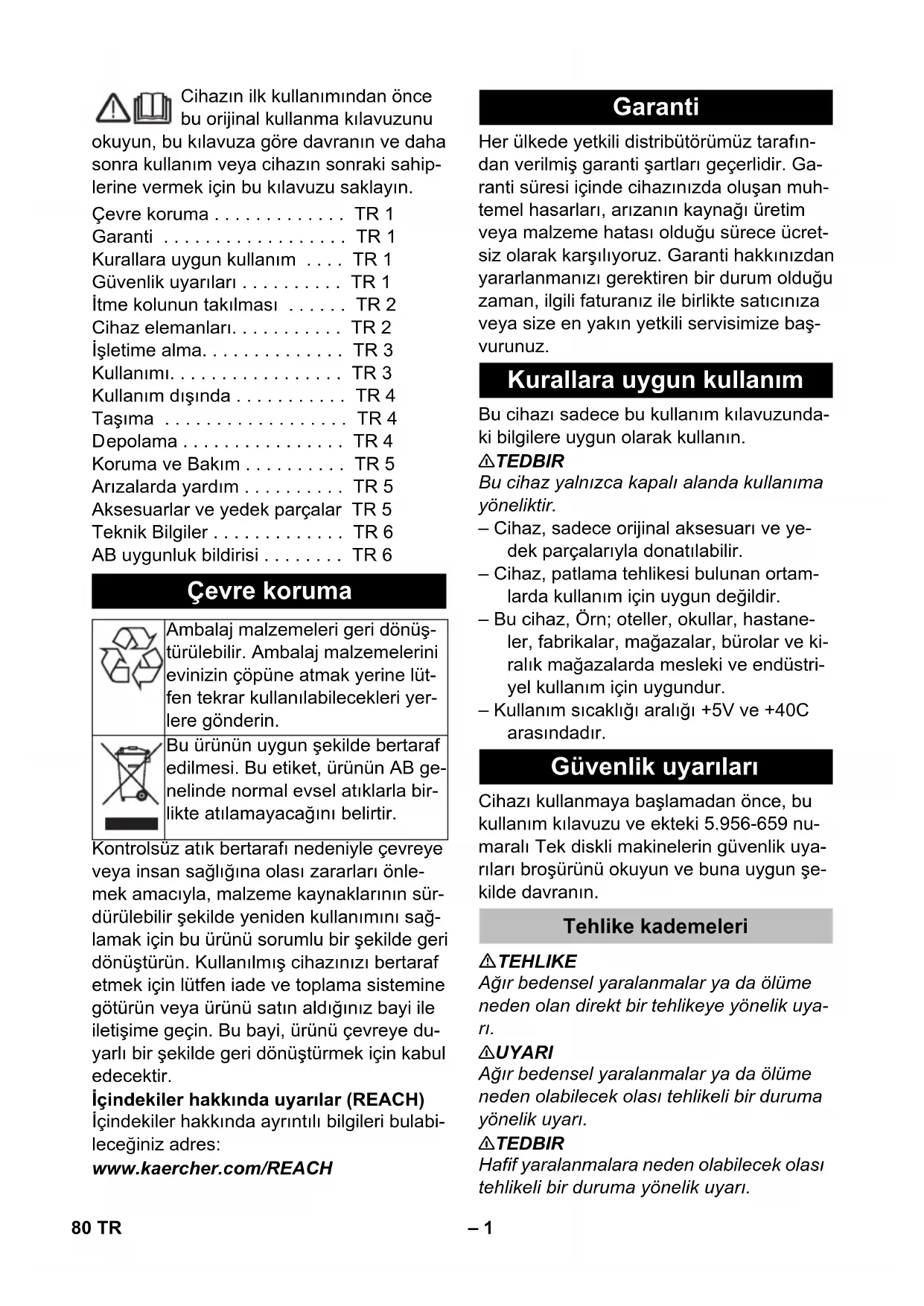 Chairman of the Board of Management Director Regulatory Affairs & Certification 79EL– 1 Cihazın ilk kullanımından önce bu orijinal kullanma kılavuzunu okuyun, bu kılavuza göre davranın ve daha sonra kullanım veya cihazın sonraki sahip- lerine vermek için bu kılavuzu saklayın. Kontrolsüz atık bertarafı nedeniyle çevreye veya insan sağlığına olası zararları önle- mek amacıyla, malzeme kaynaklarının sür- dürülebilir şekilde yeniden kullanımını sağ- lamak için bu ürünü sorumlu bir şekilde geri dönüştürün. Kullanılmış cihazınızı bertaraf etmek için lütfen iade ve toplama sistemine götürün veya ürünü satın aldığınız bayi ile iletişime geçin. Bu bayi, ürünü çevreye du- yarlı bir şekilde geri dönüştürmek için kabul edecektir. İçindekiler hakkında uyarılar (REACH) İçindekiler hakkında ayrıntılı bilgileri bulabi- leceğiniz adres: www.kaercher.com/REACH Her ülkede yetkili distribütörümüz tarafın- dan verilmiş garanti şartları geçerlidir. Ga- ranti süresi içinde cihazınızda oluşan muh- temel hasarları, arızanın kaynağı üretim veya malzeme hatası olduğu sürece ücret- siz olarak karşılıyoruz. Garanti hakkınızdan yararlanmanızı gerektiren bir durum olduğu zaman, ilgili faturanız ile birlikte satıcınıza veya size en yakın yetkili servisimize baş- vurunuz. Bu cihazı sadece bu kullanım kılavuzunda- ki bilgilere uygun olarak kullanın. 몇 TEDBIR Bu cihaz yalnızca kapalı alanda kullanıma yöneliktir. – Cihaz, sadece orijinal aksesuarı ve ye- dek parçalarıyla donatılabilir. – Cihaz, patlama tehlikesi bulunan ortam- larda kullanım için uygun değildir. – Bu cihaz, Örn; oteller, okullar, hastane- ler, fabrikalar, mağazalar, bürolar ve ki- ralık mağazalarda mesleki ve endüstri- yel kullanım için uygundur. – Kullanım sıcaklığı aralığı +5V ve +40C arasındadır. Cihazı kullanmaya başlamadan önce, bu kullanım kılavuzu ve ekteki 5.956-659 nu- maralı Tek diskli makinelerin güvenlik uya- rıları broşürünü okuyun ve buna uygun şe- kilde davranın. TEHLIKE Ağır bedensel yaralanmalar ya da ölüme neden olan direkt bir tehlikeye yönelik uya- rı. 몇 UYARI Ağır bedensel yaralanmalar ya da ölüme neden olabilecek olası tehlikeli bir duruma yönelik uyarı. 몇 TEDBIR Hafif yaralanmalara neden olabilecek olası tehlikeli bir duruma yönelik uyarı. Çevre koruma . . . . . . . . . . . . . TR 1 Garanti . . . . . . . . . . . . . . . . . . TR 1 Kurallara uygun kullanım . . . . TR 1 Güvenlik uyarıları . . . . . . . . . . TR 1 İtme kolunun takılması . . . . . . TR 2 Cihaz elemanları. . . . . . . . . . . TR 2 İşletime alma. . . . . . . . . . . . . . TR 3 Kullanımı. . . . . . . . . . . . . . . . . TR 3 Kullanım dışında . . . . . . . . . . . TR 4 Taşıma . . . . . . . . . . . . . . . . . . TR 4