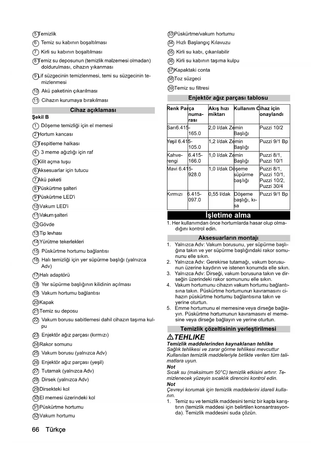Battery Power+ 36/60 2.042-022.0 6.445-085.0 Συστοιχία μπαταριών Battery Power 36/50 2.445-031.0 6.445-039.0 Συσκευή ταχείας φόρτισης Battery Power+ 36/60 (ΕU) 2.445-045.0 6.445-063.0 Συσκευή ταχείας φόρτισης Battery Power+ 36/60 (GB) 2.445-047.0 6.445-065.0 Συσκευή ταχείας φόρτισης Battery Power+ 36/60 (AU) 2.445-051.0 6.445-069.0Türkçe 65 Τεχνικά στοιχεία Με την επιφύλαξη τεχνικών αλλαγών. İçindekiler Genel uyarılar İlk kullanımdan önce cihazın, akü pake- tinin ve şarj aletinin eklenmiş orijinal iş- letim kılavuzunu ve güvenlik bilgilerini okuyun. Bu bilgilere göre hareket edin. Kılavuzları daha sonra tekrar kullanmak ya da cihazın sonraki kullanıcılarına iletmek üzere saklayın. ●İşletim kılavuzları ve güvenlik bilgilerine uyulmama- sı, kullanıcı ve diğer kişiler için tehlikeli durumların oluşmasına ve cihazın hasar görmesine yol açabilir. ● Ta şıma hasarları varsa hemen bayiyi bilgilendirin. ● Ambalajı açarken, paket içeriğinde eksik aksesuar veya hasarlı parça olup olmadığını kontrol edin. Çevre koruma Ambalaj malzemeleri geri dönüştürülebilir. Lütfen ambalajları çevreye zarar vermeden tasfiye edin. Elektrikli ve elektronik cihazlar, değerli ve geri dö- nüştürülebilir malzemelerin yanı sıra yanlış kulla- nılması veya yanlış imha edilmesi durumunda insan sağlığı ve çevre için potansiyel tehlike teşkil edebilecek piller, aküler veya yağlar içerebilir. Ancak ci- hazın usulüne uygun şekilde çalıştırılması için bu parça- lar gereklidir. Bu sembol ile işaretlenen cihazlar evsel atık ile birlikte imha edilmemelidir. İçindekiler hakkında uyarılar (REACH) İçindekiler hakkında ayrıntılı bilgileri bulabileceğiniz ad- res: www.kaercher.com/REACH Amaca uygun kullanım ● Bu püskürtme çıkartma cihazı, döşemelerin, döşe- meli mobilyaların ve küçük halı kaplı yüzeylerin ıslak temizliği için tasarlanmıştır. ● Bu cihaz yalnızca ticari kullanım için tasarlanmıştır. Cihaza genel bakış Hızlı Başlangıç Kılavuzu Şekil A 1 Akü paketinin takılması 2 Püskürtme/vakum hortumunun cihaza bağlanması, püskürtme/vakum hortumunun el memesine bağ- lanması 3 Temizlik çözeltisinin hazırlanması, temiz su kabının doldurulması 4 İşletim türünün seçilmesi Puzzi 9/1 Bp (Adv) (Pack) Ηλεκτρική σύνδεση Ονομαστική τάση συστοιχίας