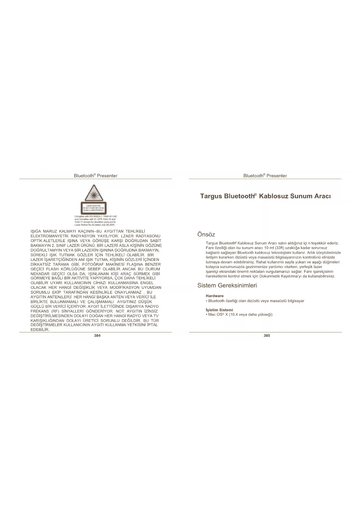 Kablosuz Sunum Aracı satın aldığınız içi n teşekkür ederiz. Fare özelliği olan bu sunum aracı 10 mt (33ft) uzaklığa kadar sorunsuz bağlantı sağlayan Bluetooth kablosuz teknolojisini kullanır. Artık izleyicilerinizle iletişim kurarken dizüstü veya masaüstü bilgisayarınızın kontrolünü elinizde tutmaya devam edebilirsiniz. Rahat kullanımlı sayfa yukarı ve aşağı düğmeleri kolayca sunumunuzda gezinmenize yardımcı olurken, yerleşik lazer işaretçi ekrandaki önemli noktaları vurgulamanızı sağlar. Fare işaretçisinin hareketlerini kontrol etmek için Dokunmatik Kaydırma’yı da kullanabilirsiniz. IŞIĞA MARUZ KALMAYI KAÇININ--BU AYGITTAN TEHLİKELİ