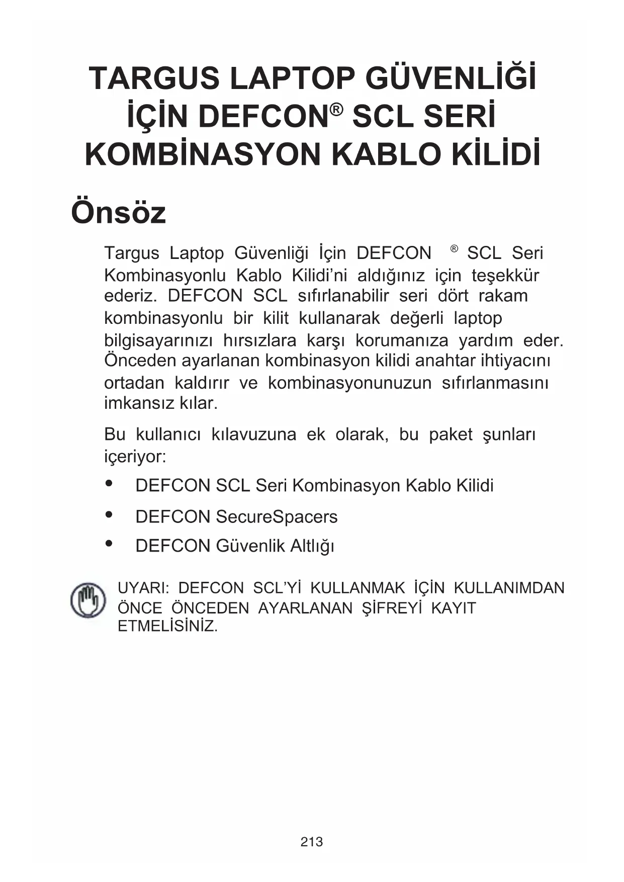 SCL Seri Kombinasyonlu Kablo Kilidi’ni aldığınız için teşekkür ederiz. DEFCON SCL sıfırlanabilir seri dört rakam kombinasyonlu bir kilit kullanarak değerli laptop bilgisayarınızı hırsızlara karşı korumanıza yardım eder. Önceden ayarlanan kombinasyon kilidi anahtar ihtiyacını ortadan kaldırır ve kombinasyonunuzun sıfırlanmasını imkansız kılar. Bu kullanıcı kılavuzuna ek olarak, bu paket şunları içeriyor: DEFCON SCL Seri Kombinasyon Kablo Kilidi DEFCON SecureSpacers DEFCON Güvenlik Altlığı UYARI: DEFCON SCL’Yİ KULLANMAK İÇİN KULLANIMDAN