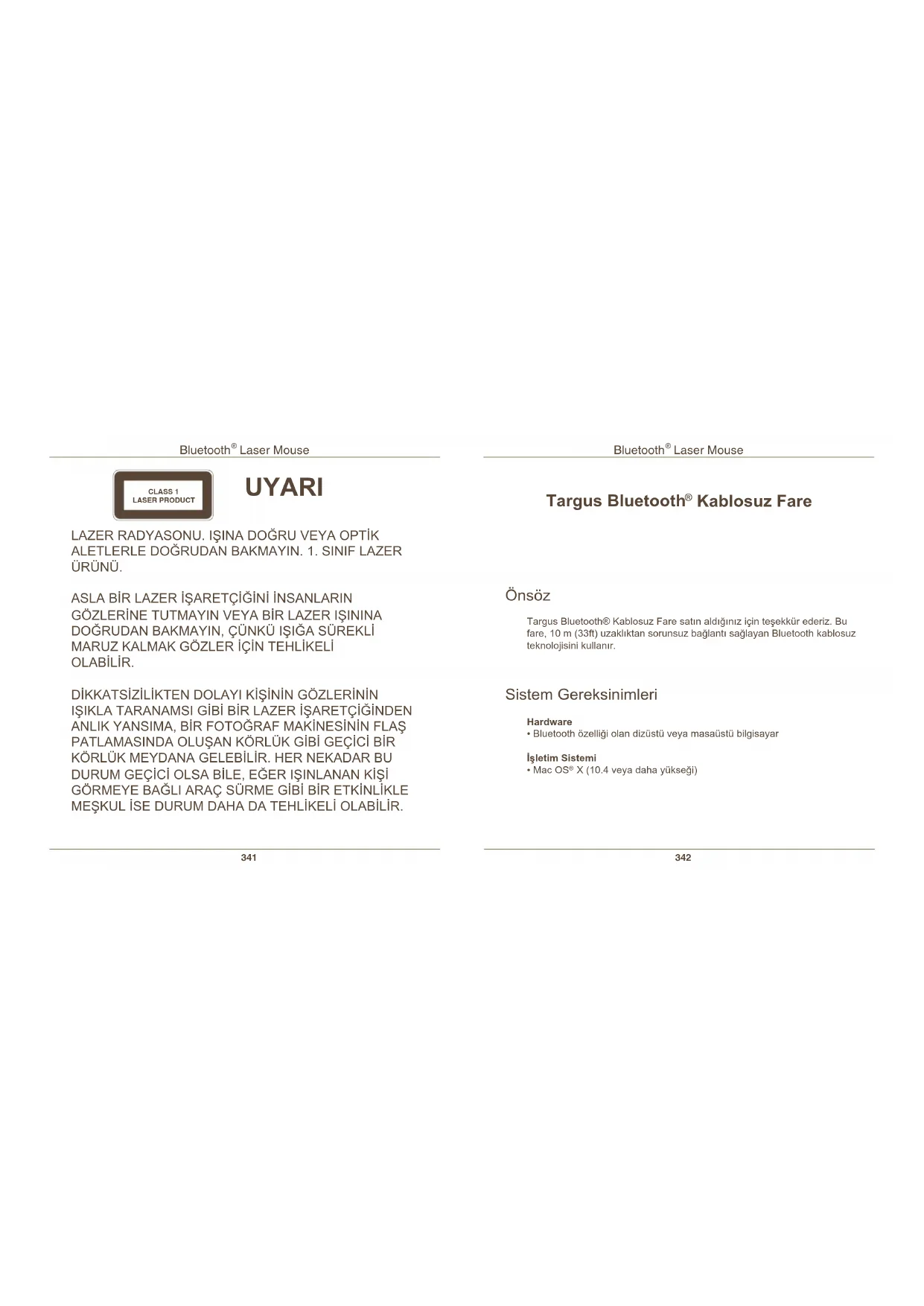 Kablosuz Fare Önsöz Targus Bluetooth® Kablosuz Fare satın aldığınız için teşekkür ederiz. Bu fare, 10 m (33ft) uzaklıktan sorunsuz bağlantı sağlayan Bluetooth kablosuz teknolojisini kullanır. Sistem Gereksinimleri Hardware• Bluetooth özelliği olan dizüstü veya masaüstü bilgisayar İşletim Sistemi• Mac OS X (10.4 veya daha yükseği) LAZER RADYASONU. IŞINA DOĞRU VEYA OPTİK
