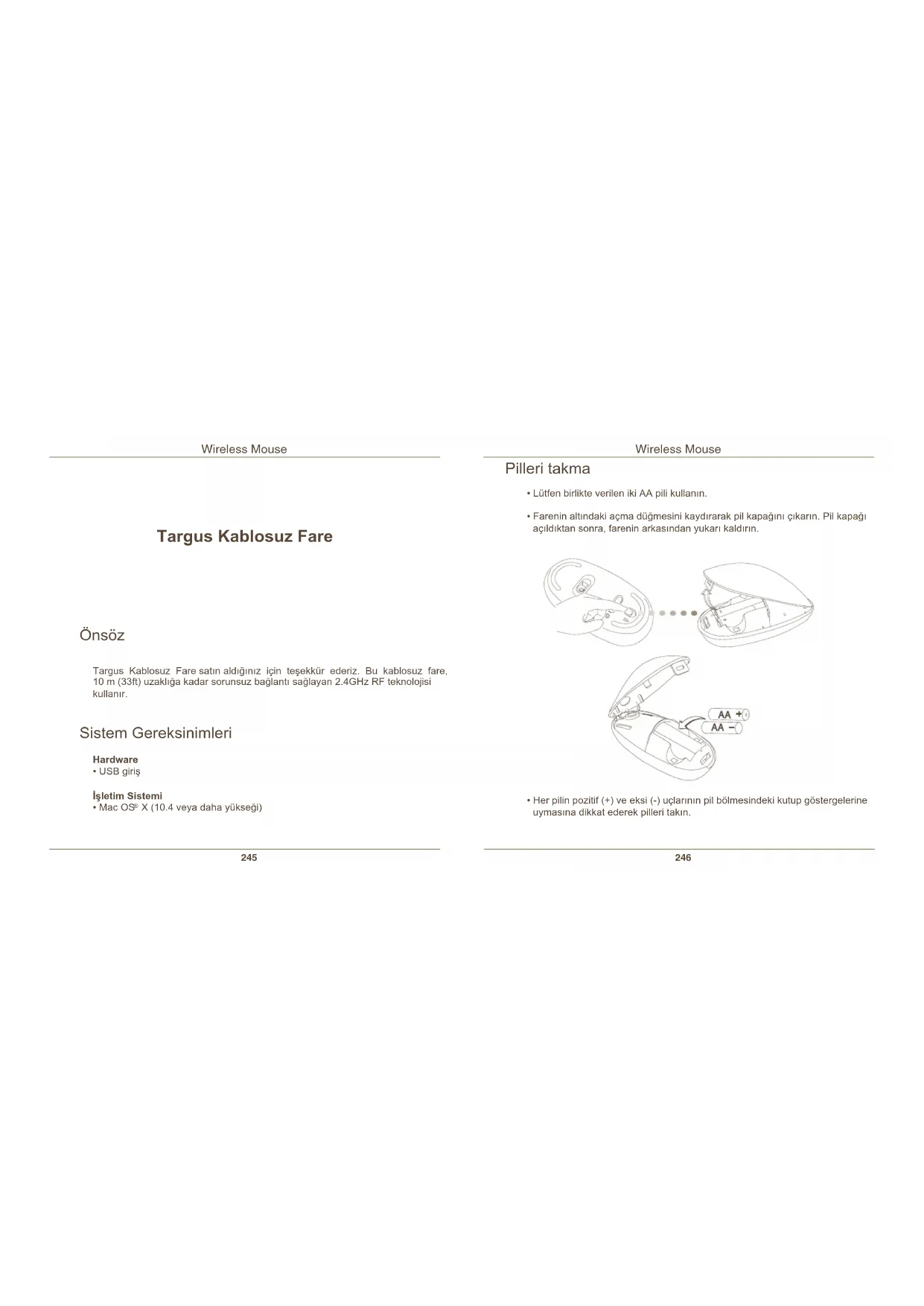 Targus Kablosuz Fare Targus Kablosuz Fare satın aldığınız için teşekkür ederiz. Bu kablosuz fare, 10 m (33ft) uzaklığa kadar sorunsuz bağlantı sağlayan 2.4GHz RF teknolojisi kullanır. Önsöz Sistem Gereksinimleri Hardware